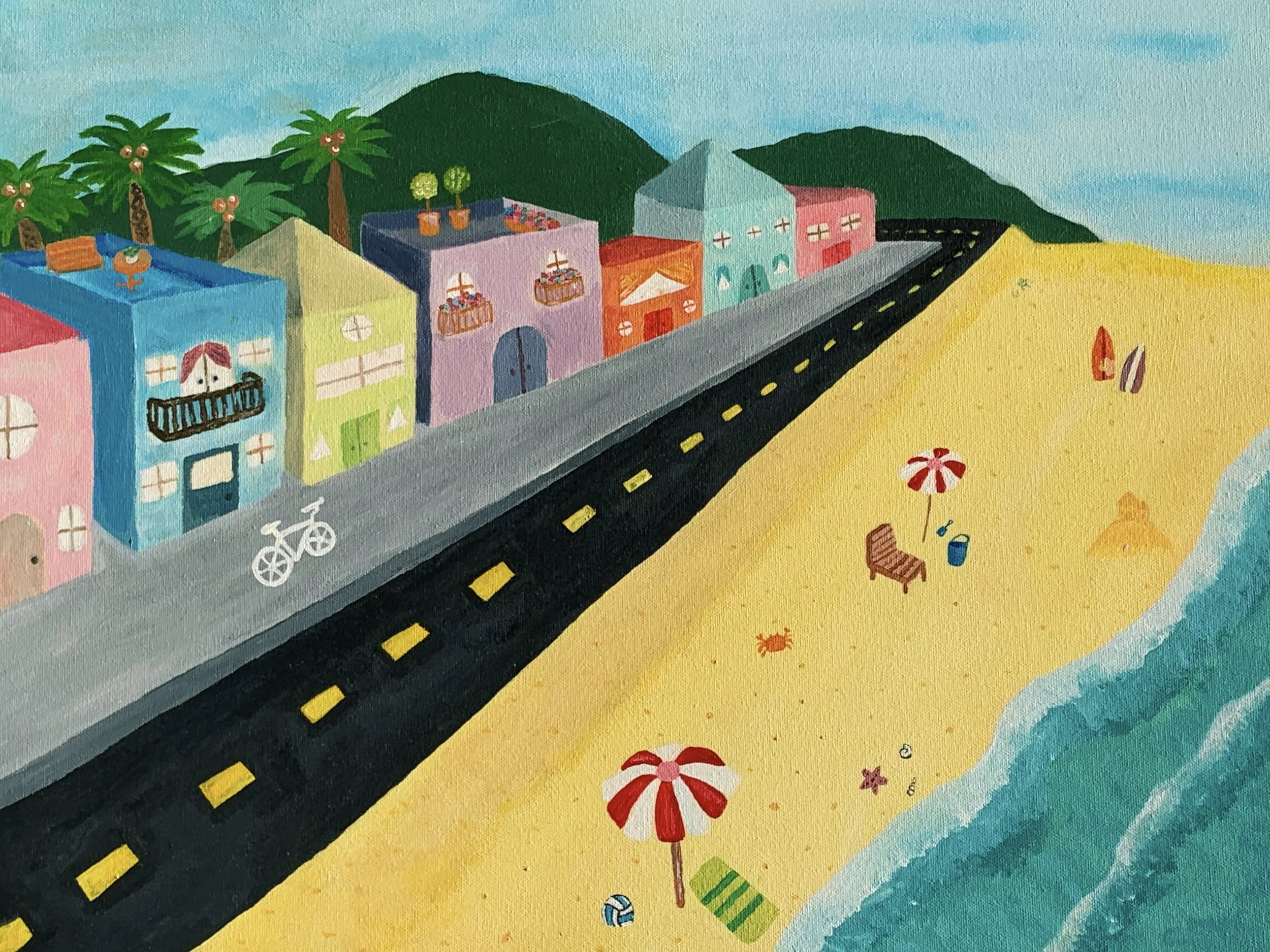 California Dreaming Physical Art Sep 15 Written By Tools BACF View fullsize Nikki L. Artist Statement Beachy acrylic painting scene with bright colors and flat shapes! CYA Artist Tools BACF
