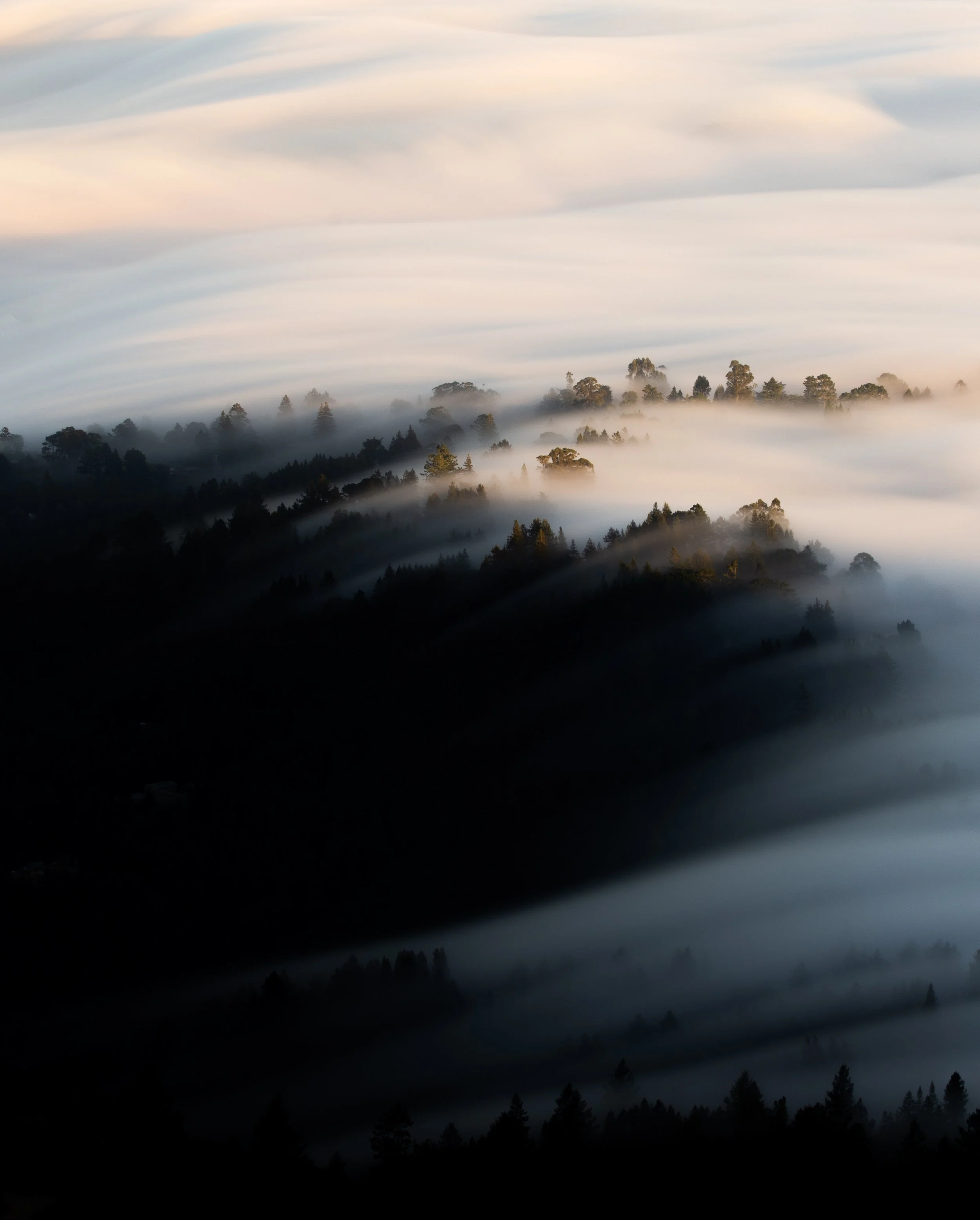 This photo was taken up on Mt. Tamalpais. The fog was flowing over a ridge on the east side of the mountain, and I hiked down this dirt road to get a unique vantage point. The light was very interesting as it was starting to disappear and the fog had very intense textures. I decided to take a long exposure to exaggerate the light and the textures on the fog.
