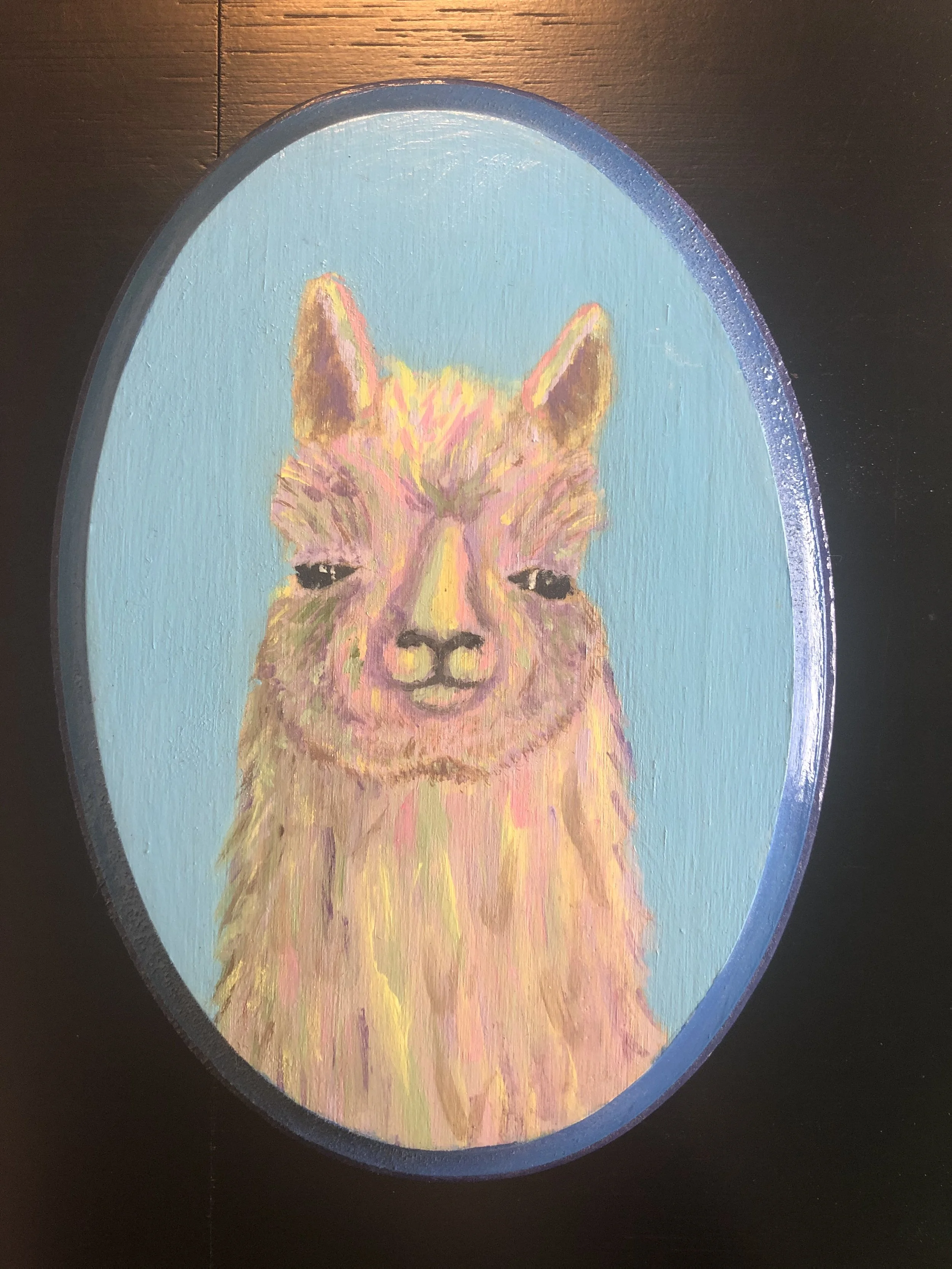 Painting; used acrylic paint, wanted it to be more colorful. Llamas to me a happy animals and I wanted to get that happy feeling through the colors I used.