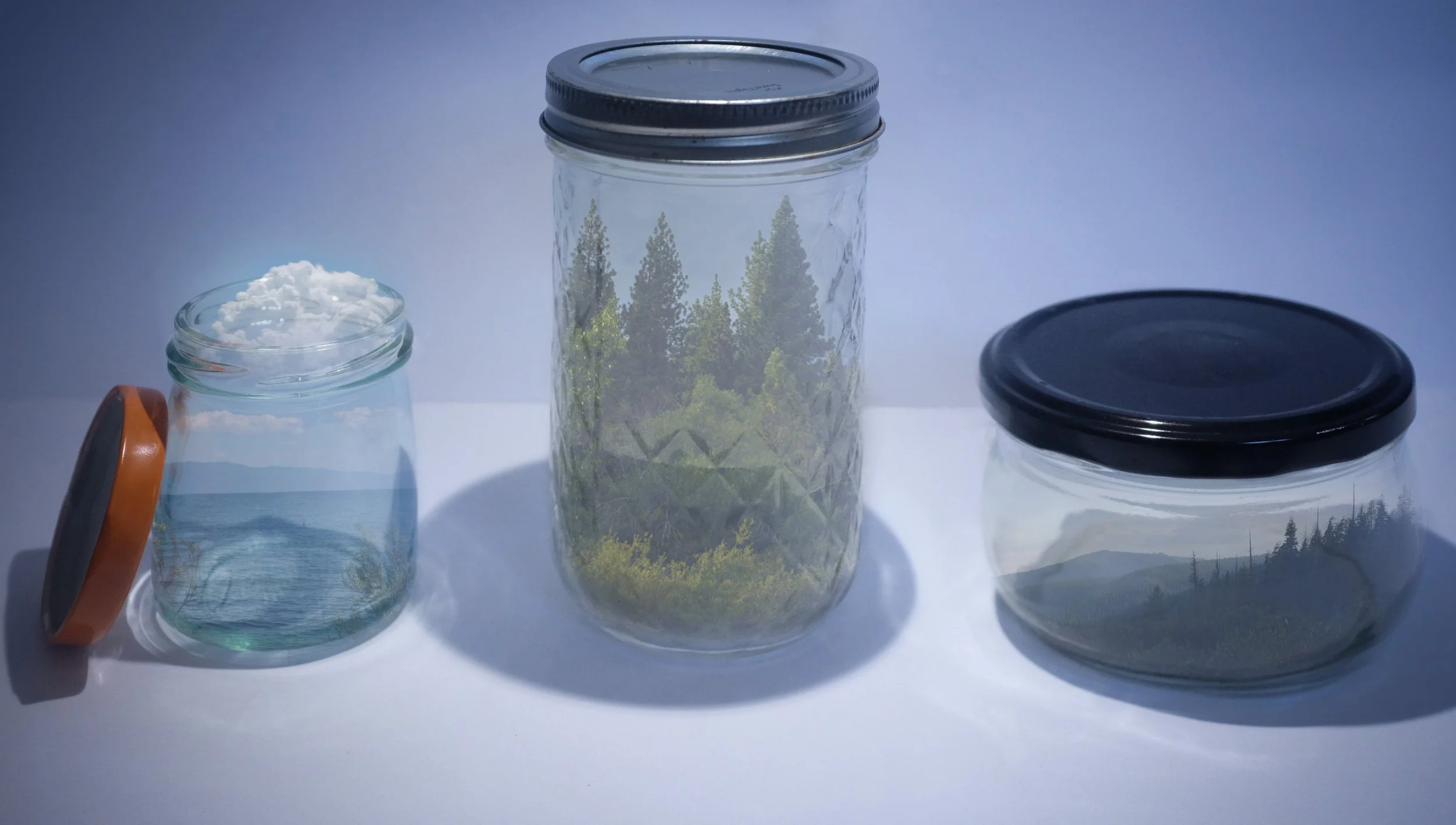 This photograph illustrates the dichotomy between freedom and security through the use of the multiple exposure technique. The photograph was composed of several separate images which had been edited into a single frame; and these images include a mountain slope, a forrest landscape, a lake scene, and a cloud. Despite the fact that the pristine landscapes contained within the jars are shielded from external influence, they remain a pale imitation of nature in a free state, which is reflected by the escaping cloud. The cloud becomes increasingly solid as it exits its container, although the vibrance of the sky contained within the jar appears to fade into the grey background, revealing the consequences of freedom.