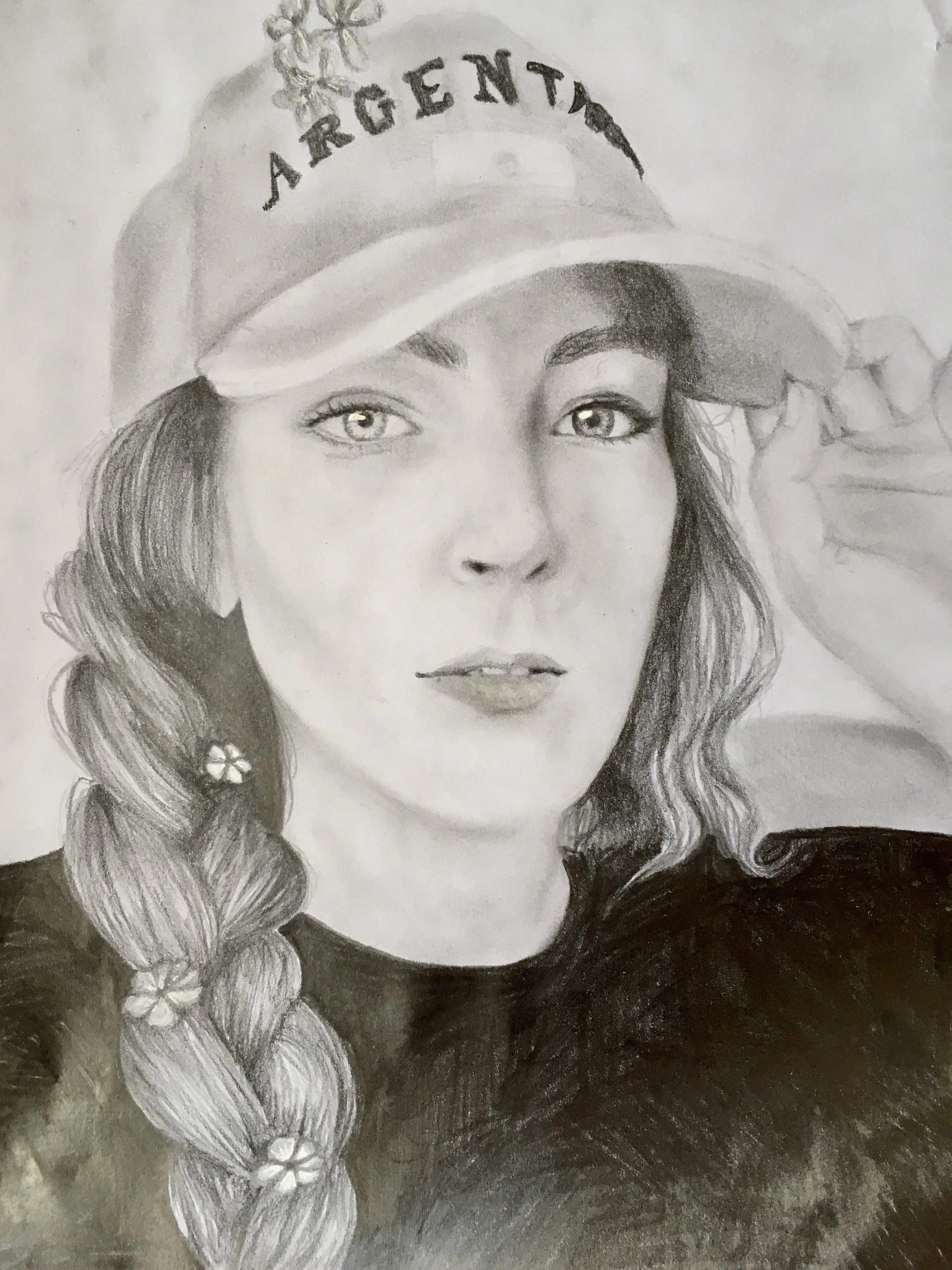 This is a self portrait from a selfie I took while on a walk with a friend before the pandemic. It represents a moment where I felt very happy, and brings back good memories.