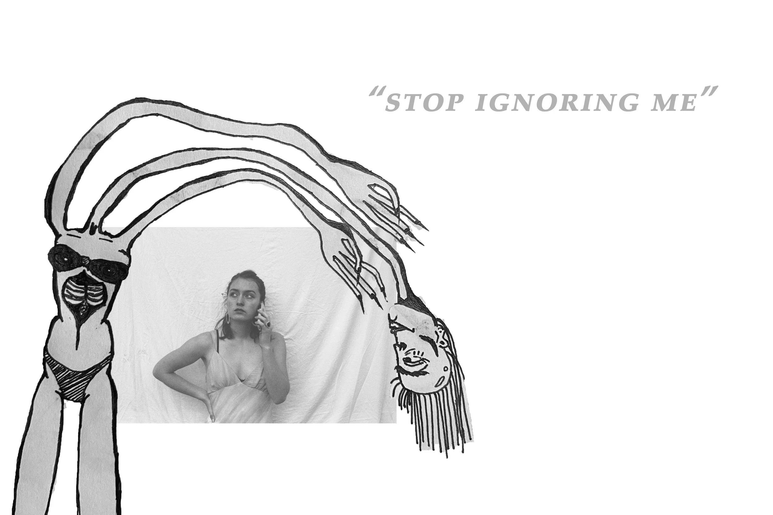 I use drawings to portray the voices in my head that won't leave me alone. This image is showing the voice of insecurity and doubt which is a character who is persistent and unforgiving. I use both photography and drawing to express the fact that in this situation there are two aspects affecting each other, the visible and the invisible.