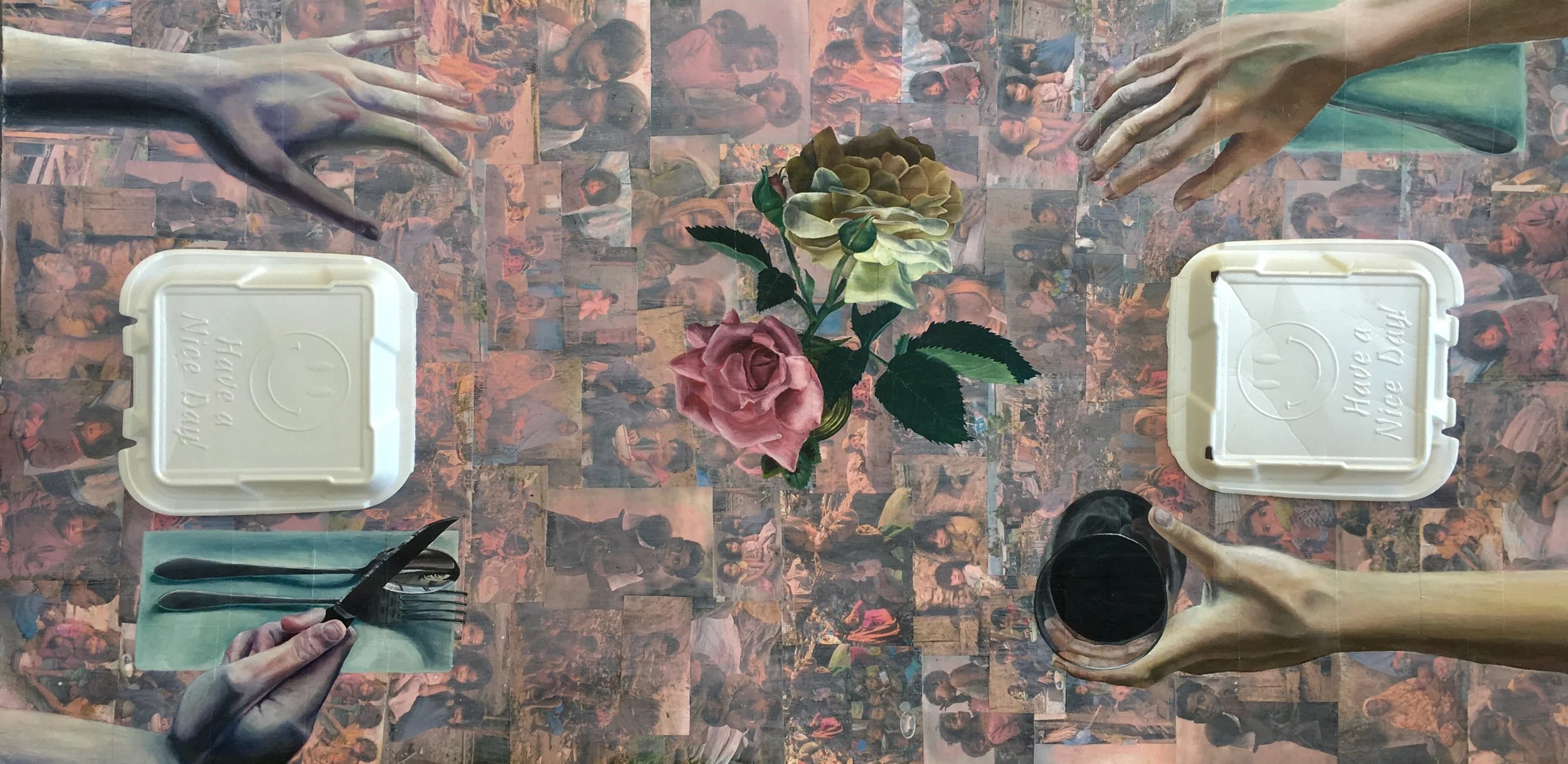 This piece was influence by the unequal distribution of resources around our world. Often times in our Western society, we consider take out as a mundane meal. In reality, we are extremely fortunate to have this type of ready access to food, as many live in poverty. This can be shown through the hands, cutlery, flowers, and take out boxes resting on a table top composed of images of starving and impoverish children. The dimensions are 2ft x 4ft and the materials I used are acrylic paint, collage images, real take out boxes, and a plywood board for my canvas.