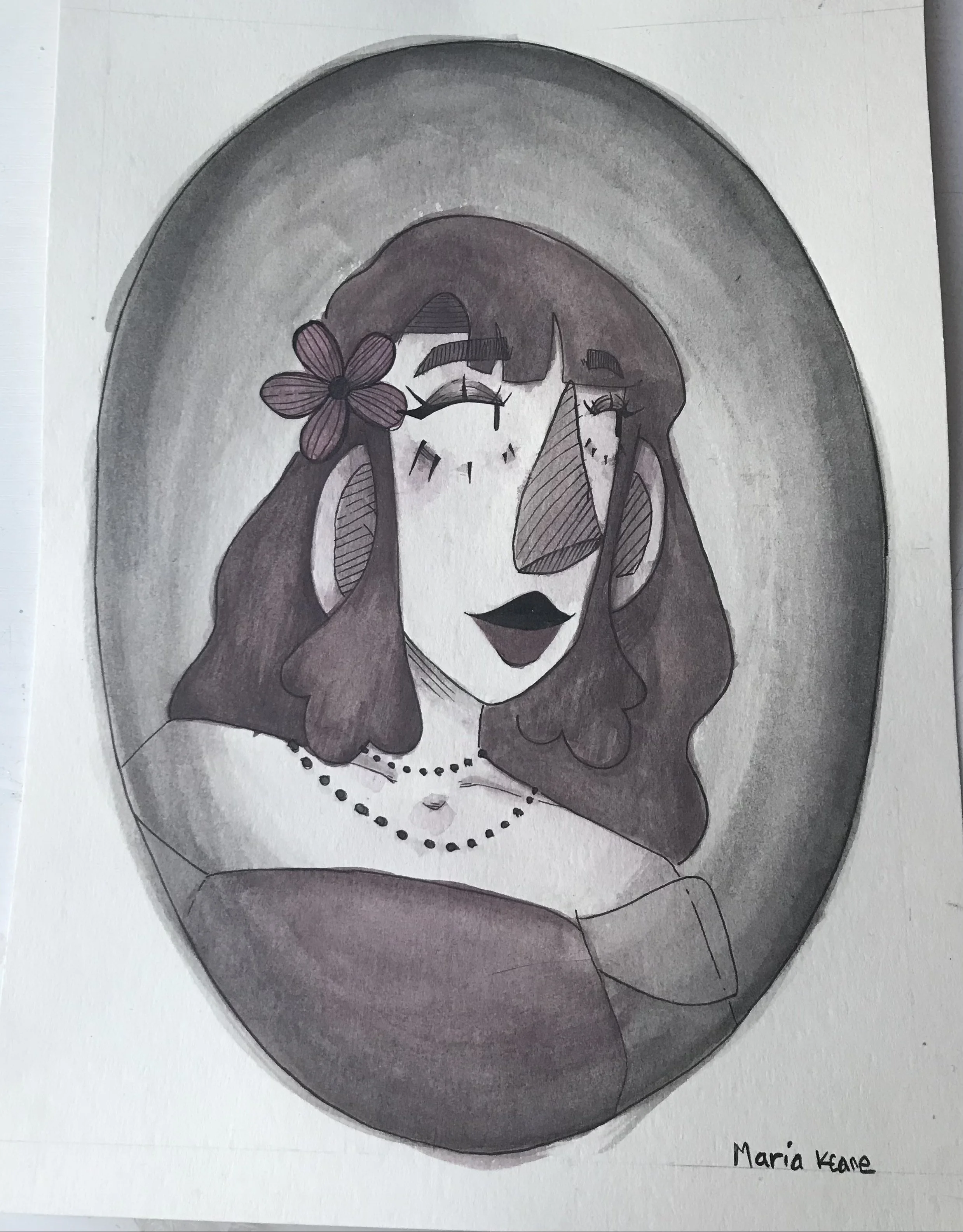 Mixed media: A victorian style cameo of a woman with a flower in her hair. Made with watercolor and black ink.