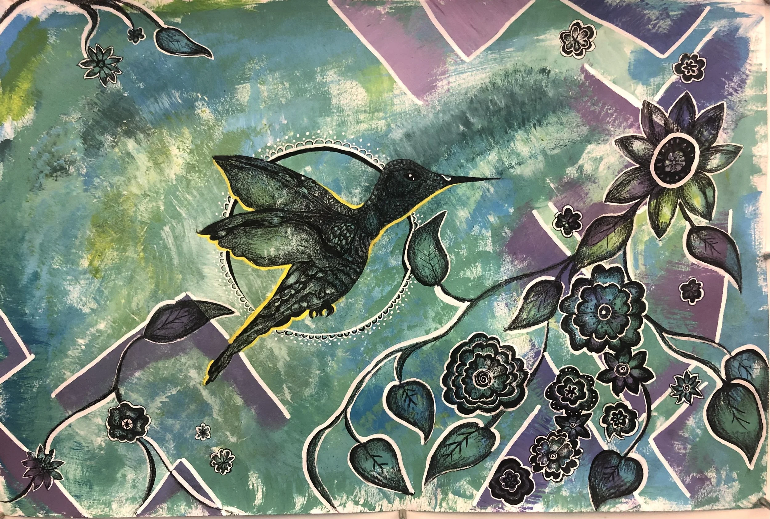 This piece is inspired by the memory of my grandmother. In Hindu culture, a widely held belief is the idea of reincarnation, and when my grandmother passed away, we believe that her spirit manifested itself into the form of a hummingbird. The background is painted in her favorite colors, and the flowers are representative of the ones she had in her garden.