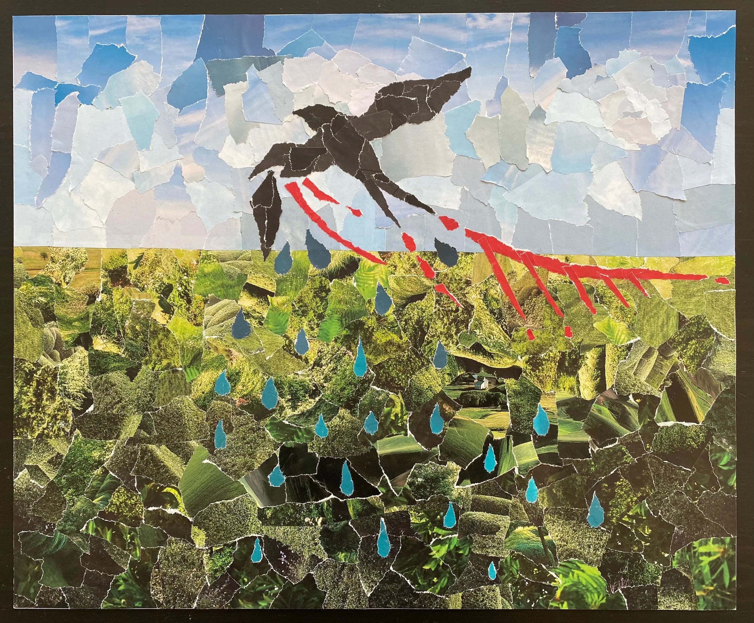 To make my collage, I tore up the pages of magazines and used the torn pieces of paper to put together an image of this metaphor. I started with the countryside, and then the sky, followed by the bird with a broken wing. I chose a swallow as the bird because of its distinct silhouette and the way the blood and tears contrast with its melancholy voice. After this, I added the blood trailing behind the swallow, and as a final touch, I covered the countryside in tears to represent the sorrow burying the crops.
