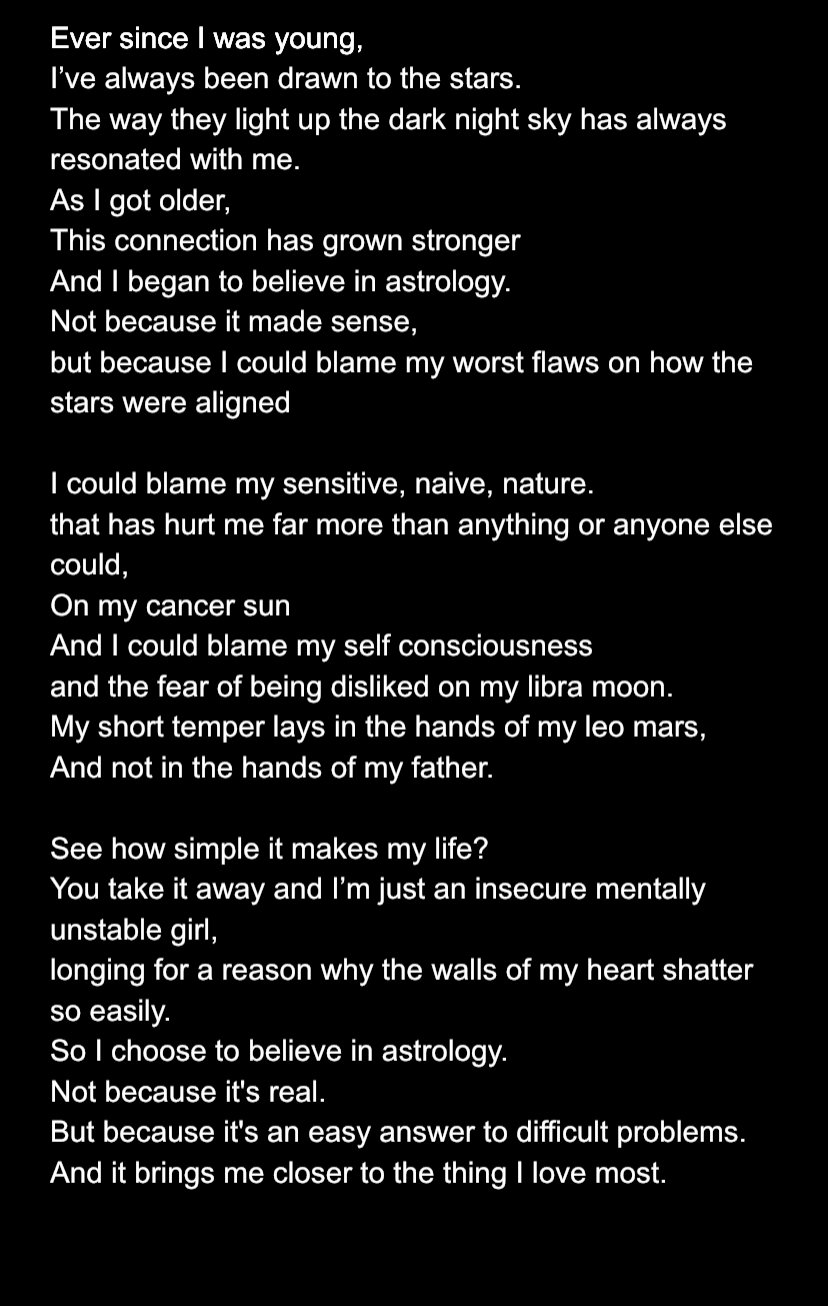 Blame It on the Universe is a personal poem that talks about how easy it is to blaming your flaws on astrology instead of actually trying to change them.