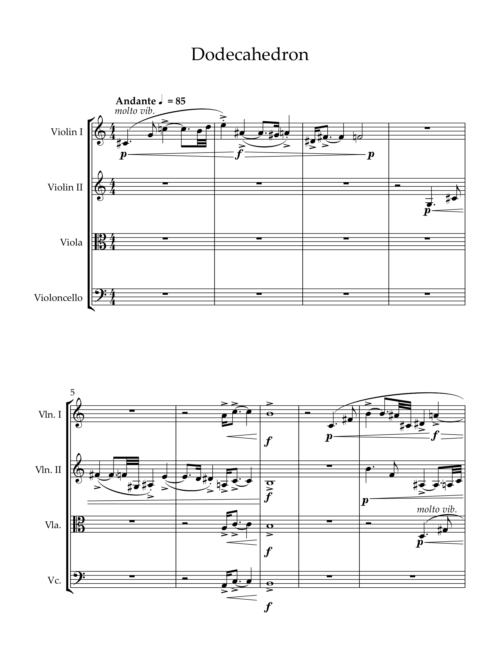 Dodecahedron is built on a twelve-tone row (C# G C B D E A# G# A D# F# F). Its structure emerges from continuous motivic transformation involving this core material. The piece begins with twelve statements of this row, transposed (in order) to the pitches contained within it and sometimes layered over one another. Several developments follow: a fugue, a restatement, a melodic theme accompanied by echoes of itself. A contrapuntal section less bound by the rules of fugal writing sees the theme get broken down to an even greater extent than before. It culminates in a section where all instruments speed up together as the row is played in chunks of two notes by each pair of instruments, alternating between being played in the standard direction and in retrograde. Following three emphatic statements of the first three notes of the row, the piece closes with a highly contrasting coda, ending in a state of harmonic stillness.