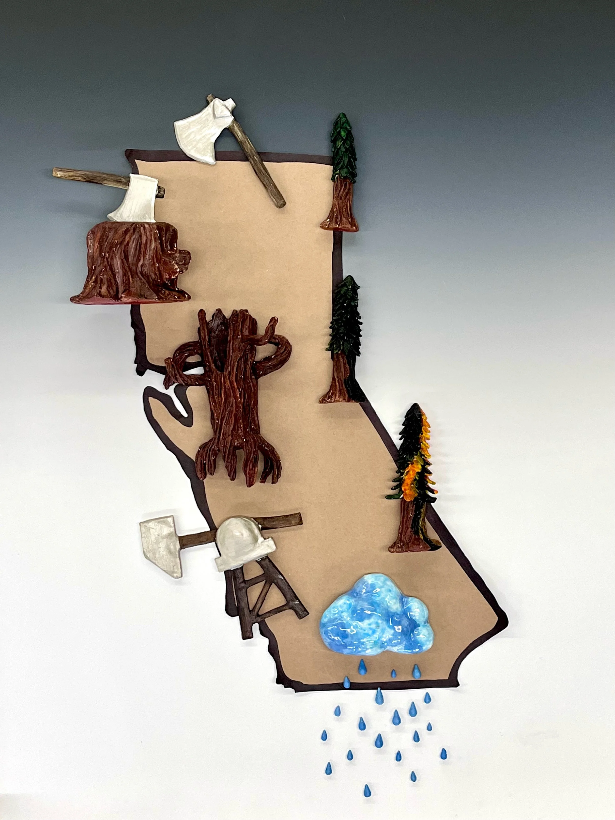 As a Californian, I wanted to explore the history and current state of where I call home. Living in California can be amazing but scary at the same time. I wanted to showcase the vast injustices we have done and continue to do to this state. California has so much to offer but we do very little to take care of the land that is allowing us to be so prosperous. We have been deforesting land at exponential speeds, drilling for oil to line the pockets of the rich, causing destructive wildfires that displace humans and wildlife, and we have been in a severe drought for many years, these are all very alarming for our future. The damage we are causing to the Golden State cannot be sustained for much longer and it would be devastating to see this luscious state go to waste and peril at the hands of the rich robbing myself and other generations of the rich experiences and vitality this state has to offer. I tried to show a clear depiction of all of the horrendous things humans have been doing that has led to areas like the Bay Area to be amongst one of the wealthiest areas to live whilst having so many issues with homelessness that need to be addressed. During construction, I always referenced photos of trees to try and bring them back to life and show the damage we caused them. I hope with this exploration that people walk away from this project and think about the damages humans cause not only to our planet but to the state where I live. Every time I walk out my door, I am greeted with the beauty of California and when I travel in the state; I see the elegance and grace of other parts of the state and the stain of destruction, loss, and devastation. We have the Redwood and Sequoia trees in the north, the valleys throughout Central California, the remnants of a river that used to exist in Los Angeles, and the many mountains and stunning coastlines everywhere around the state. To see all of these natural wonders go to waste is deeply saddening and it is a disservice to all generations. This work serves as a call to action to change the path humans are on and to reinvest in the beauty that California has and restore balance.