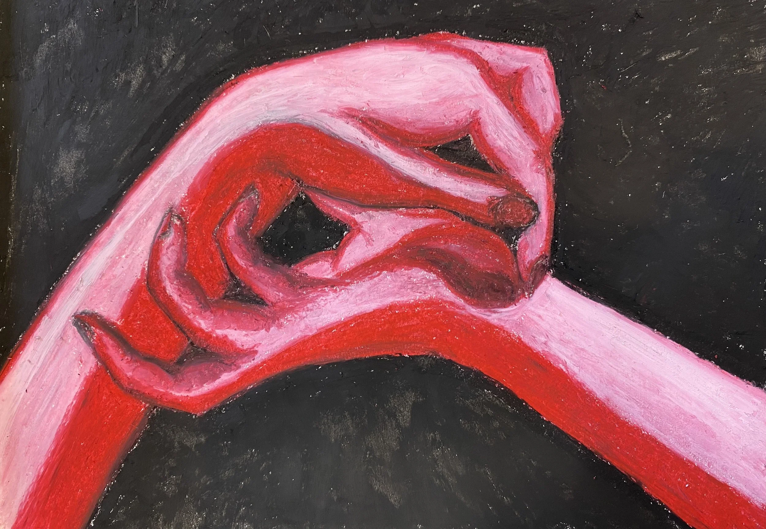 I found a stunning reference image and felt inspired. I wanted to convey something intimate and sensual with simply hands. We are often overwhelmed with images of intimacy being of physical bodies or clothing. I wanted to draw something truly human, something that I feel is filled with real soul, our hands. Hands are filled with curiosity, our passion and most intense emotions flow through them. So I wanted to convey a true sense of intimacy with what I consider can be one of the most intimate parts of our bodies, our hands, fingers, and wrists. I also have never used oil pastels and wanted to experiment. I ended up really liking how it turned out, the extremely vivid colors were perfect for my vision.
