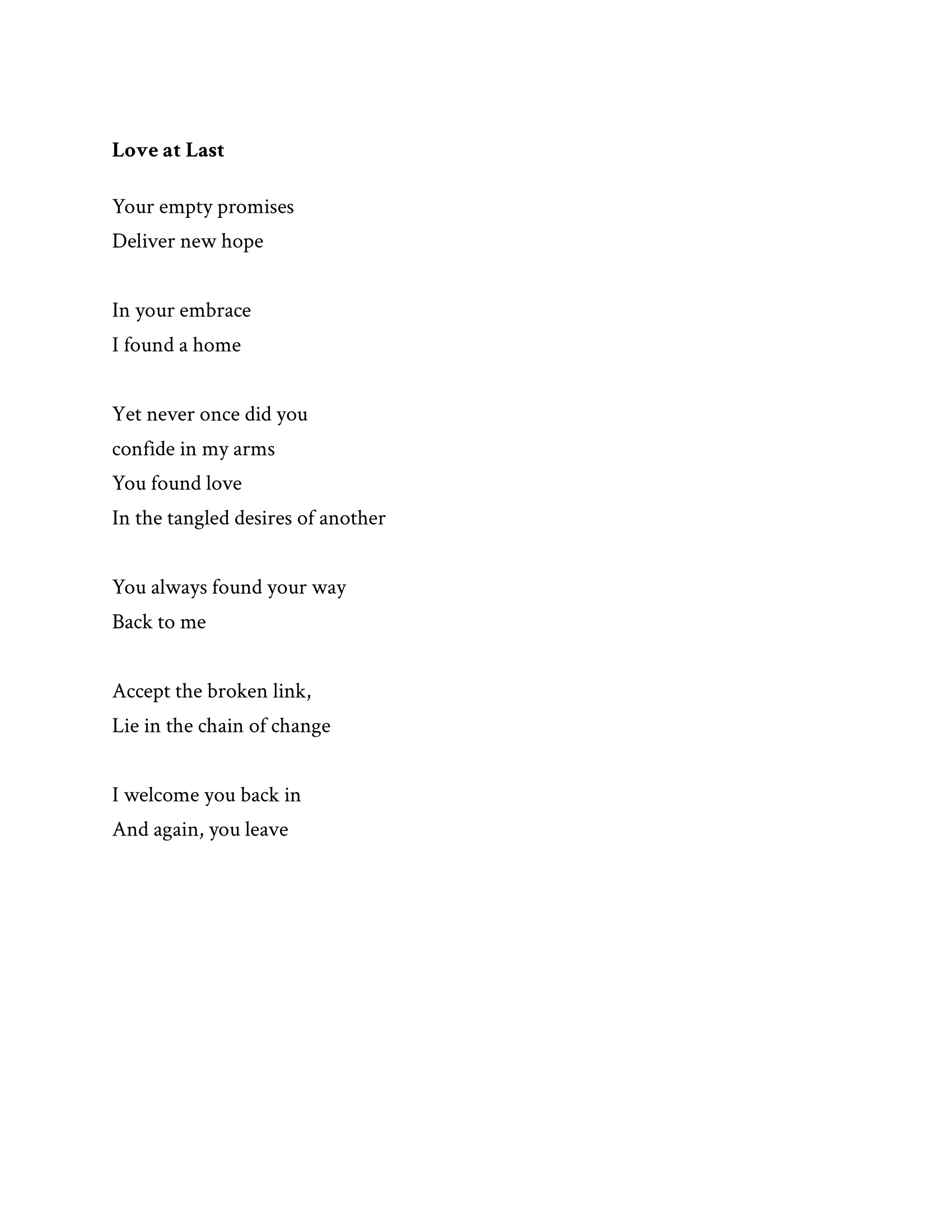 For a majority of the artwork that I make, and end up liking, all ties into a certain memory or feeling that I strongly connect too. It’s important that the pieces I create all relate together to show different aspects of myself, whether they be positive or negative emotions. For a lot of my poetry I like having the theme of either toxicity or heartbreak. I write these types of poems because it allows me to use imagery to create a darker perspective. I think it’s important to explore different narratives in writing because it can allows for myself to be more personal in my work, but at the same time it hard to write something about an event, or person in your life, because it means being vulnerable in a way where everyone can see you, which can be terrifying sometimes.