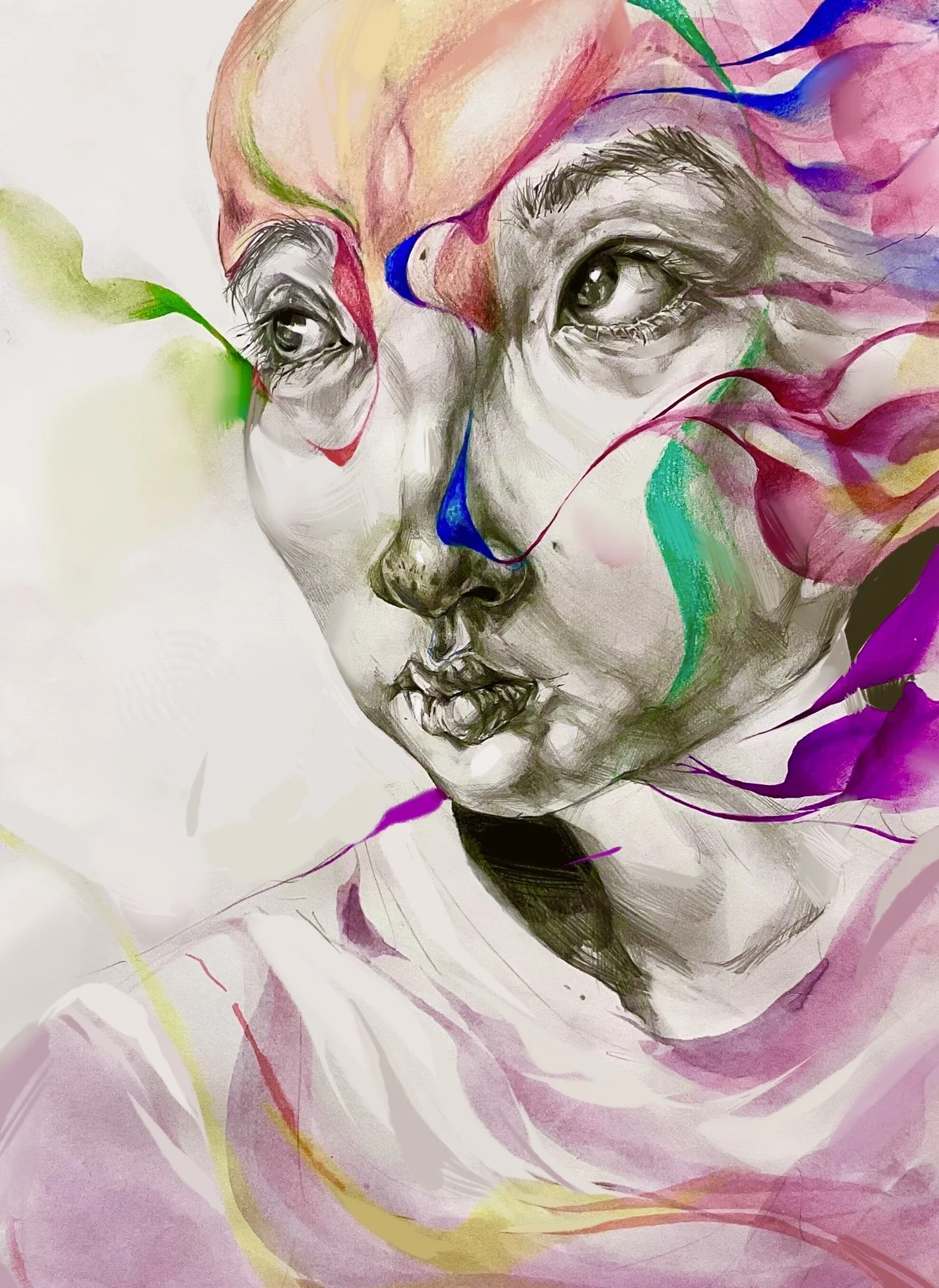 Our emotions. Yes, our thoughts, our creativity, our brains, our emotions. In my artwork, I depict a black and white image of me. The depressive monochrome color palette resemble the physical, mundane aspects of a human. Distorted features further eventuate how “inhumane” our physical body really is. However, as we take a look at the right side, we find the reason why this artwork was created. To express the beauty and grace of emotions. While in a deep daze, emotions ooze from my mind as I imagine 10 thousand colored unicorns, circular floating houses, and friendly robots. Creativity. That is what makes me and 7 billion other people human.