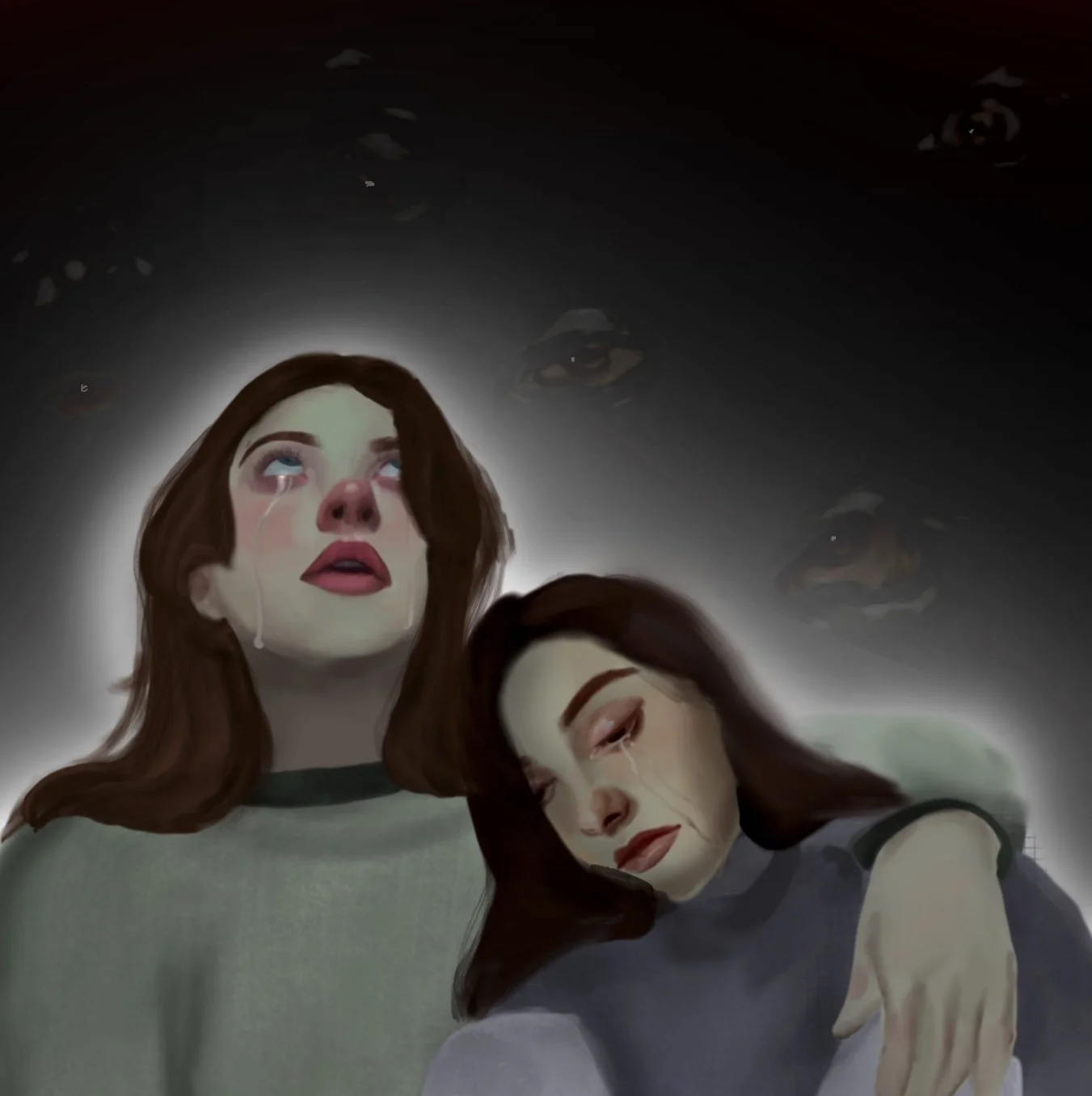 My piece is a representation of the dynamic a sibling relationship has. The comfort as well as protection an older sister can provide. It is based on my own experience and relationship with my sister. The artwork depicts an older sister holding the younger sister as a light “shield” pushes back the darkness surrounding them.