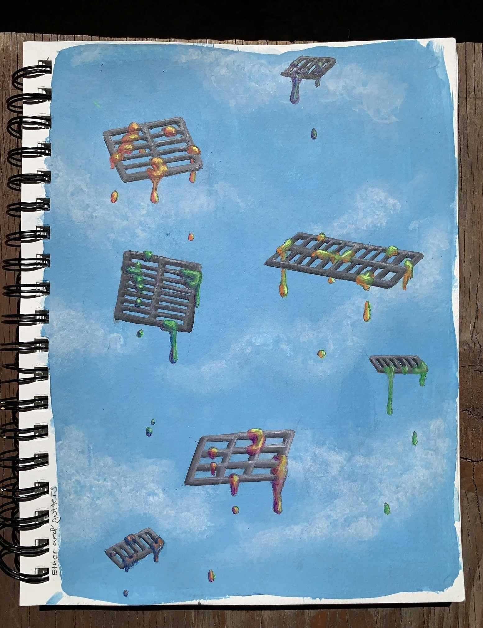 One day I was biking and I was thinking of little phrases I could base paintings off of. “Ether and gutters” popped into my head and I imagined grates in the sky with weird liquid dripping off of them. So that’s what I painted.