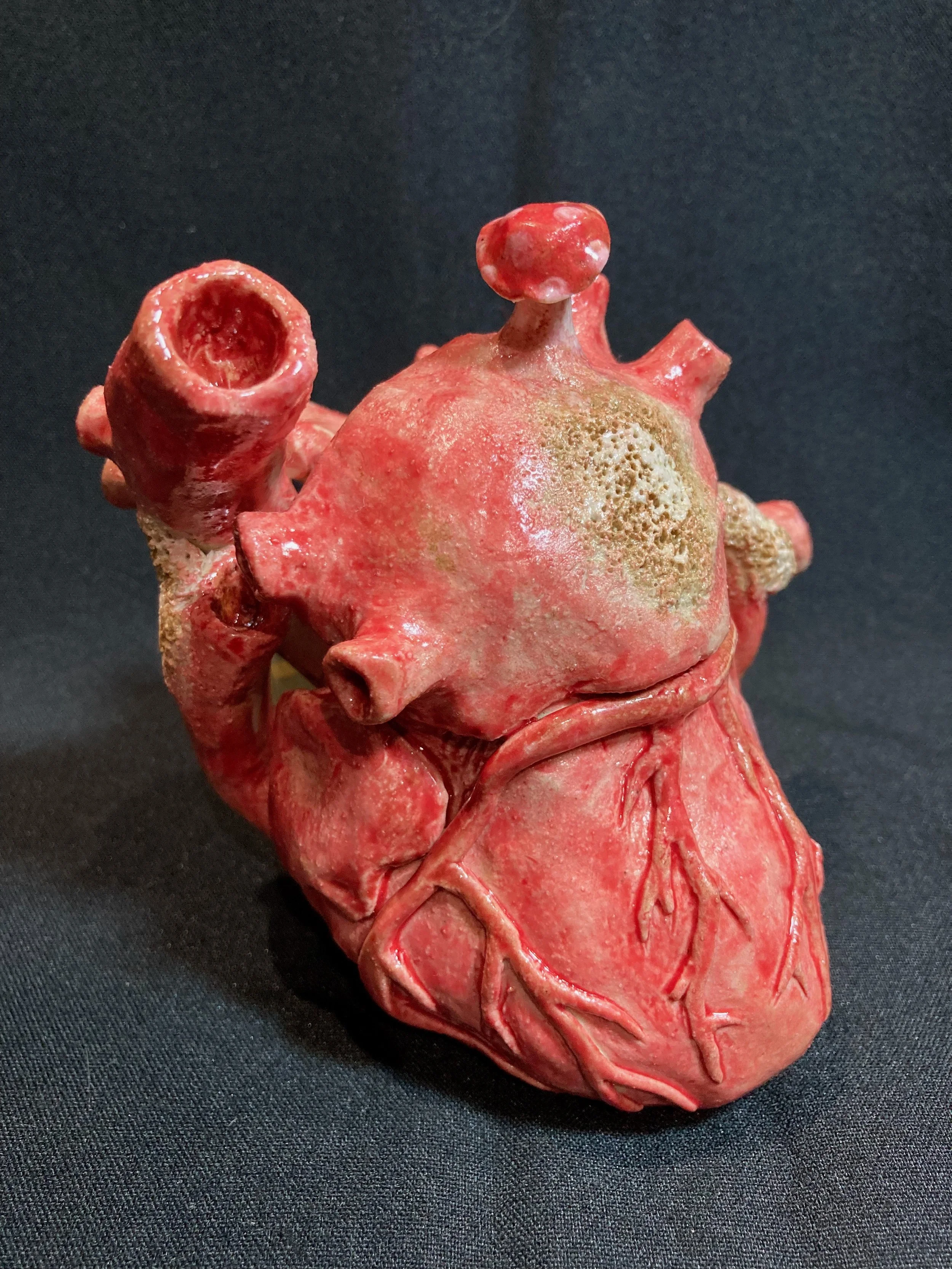This is a ceramic piece that I made with clay. It is meant to be a human heart, with patches of mold and a small mushroom growing out of it. I used various pictures of human hearts that I found online to make it the most realistic piece possible.