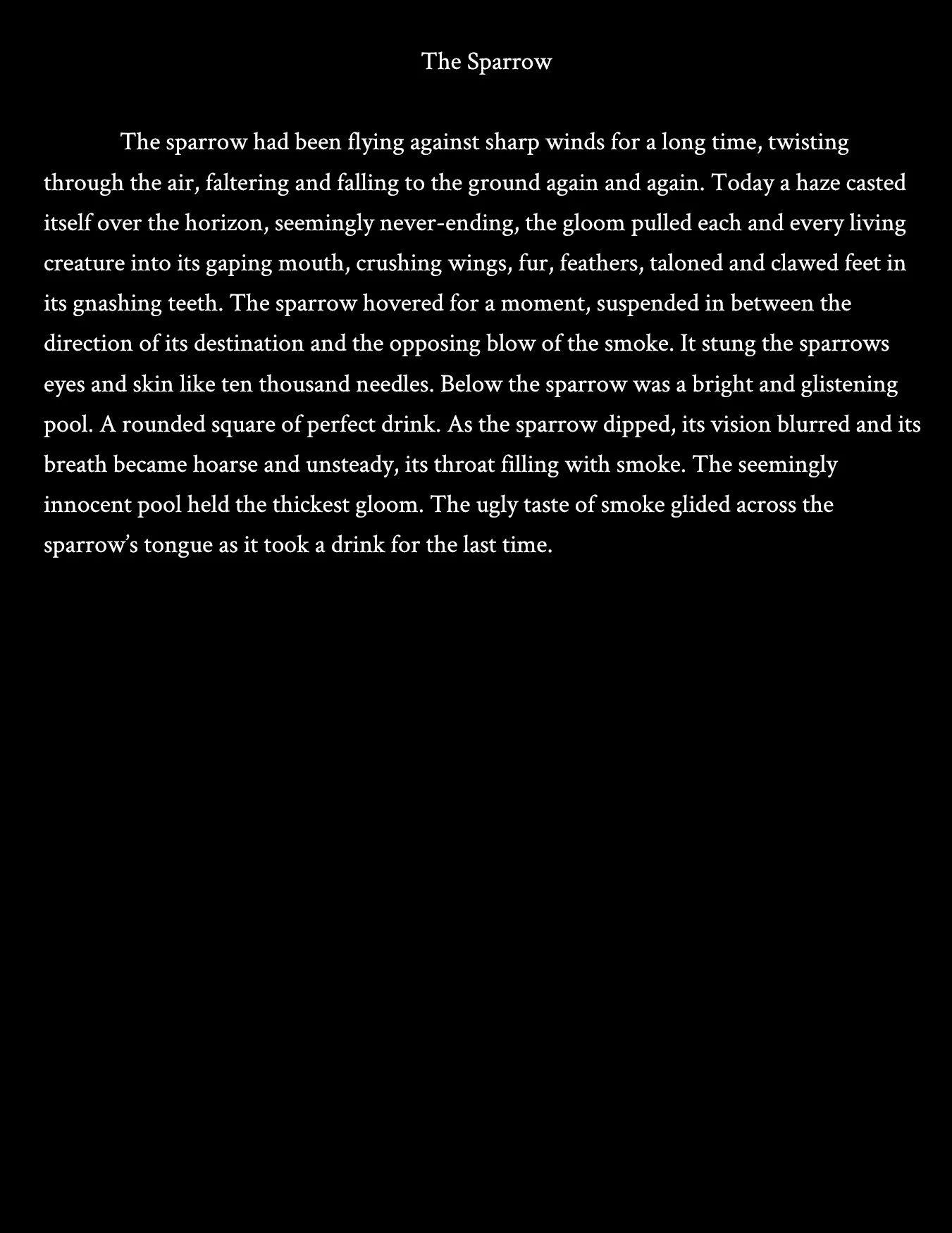 This piece was written because of a prompt given to my creative writing class at the beginning of the year. The prompt was a picture of a swimming pool that was structured on the top of a building seemingly in a cityscape. During the time I wrote this, fires in California were at an extreme high. The sky was hazy, and all I could think about was how is wildlife coping with this? Is the only thing they know what to do in this situation is to run, swim, crawl, or fly?