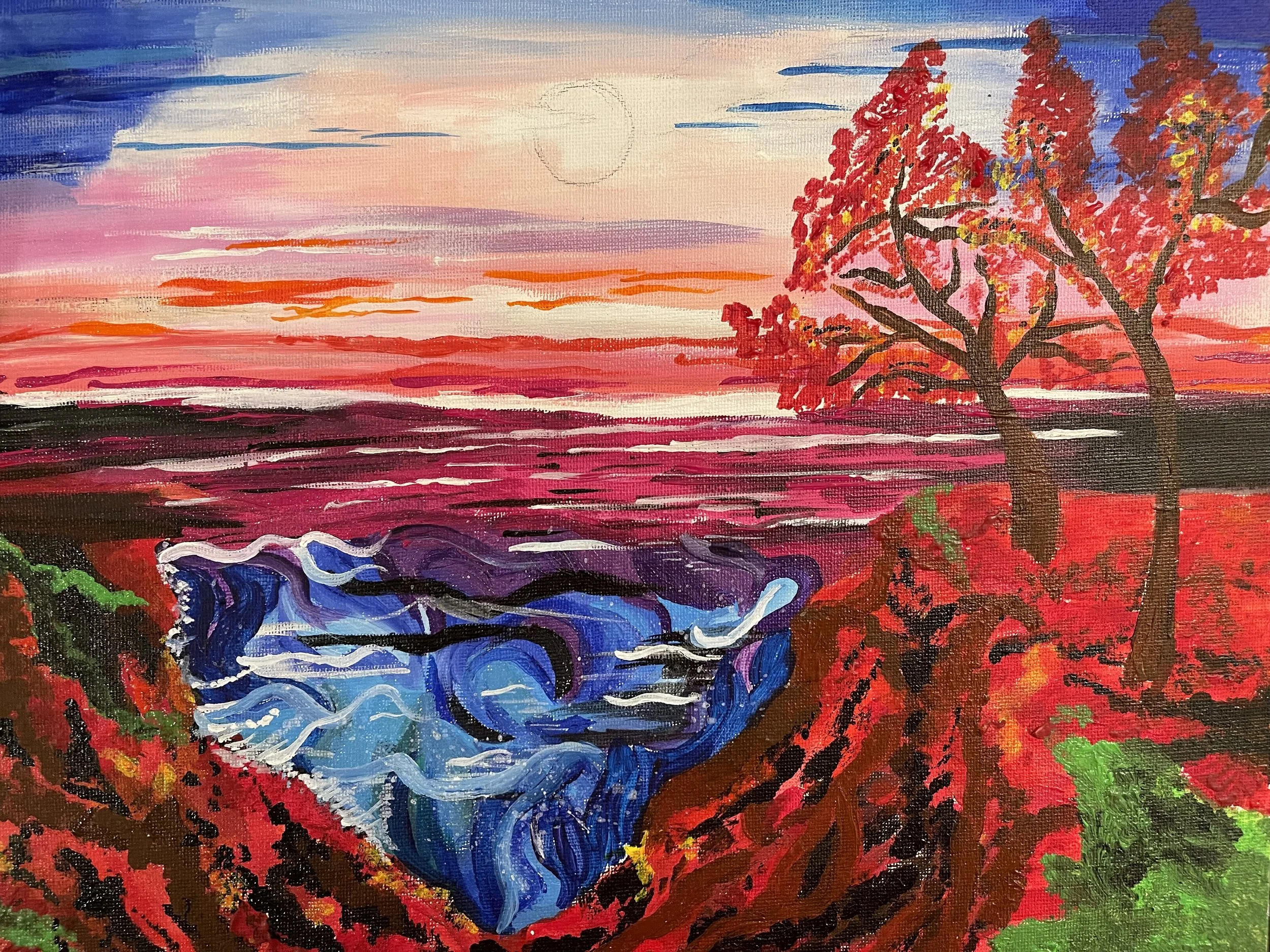 My artistic process typically consists of getting into a free and calm mindset through listening to music and simply examining some of my paint brushes. This piece of artwork is based off of a painting of Bob Ross that really stuck out to me because of its vivid colors. I love painting colorful works of art and bringing life to nature through art. Although creating this painting was not a straight-forward process and involved me panicking over certain mistakes, I was able to harness my errors to make the painting look as unique as possible. My mistakes ended up defining my painting and making it stick out from previous works that I had made before.