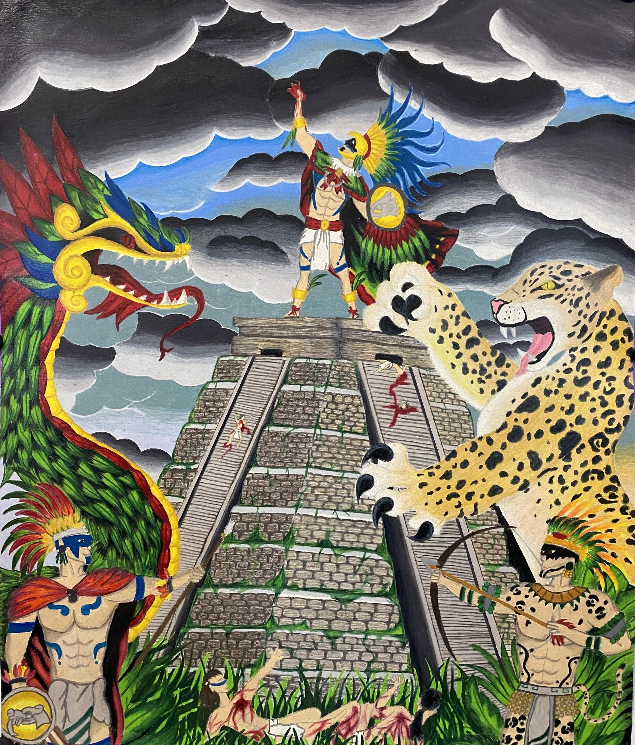 This piece of Artwork was done in color pencils. My inspiration for my piece comes from my interest in Aztec mythology which I find to be very fascinating. Aztecs believe in multiple gods also known as sun deities, but my main focus is on three sun deities Huitzilopochtli, Quetzalcoatl and Tezcatlipoca. The first sun Tezcatlipoca, god of the night sky and sorcery, seen as the jaguar. The second sun Quetzalcoatl, god of the air and wind, is seen as the serpent. The first two sun deities were enemies, Quetzalcoatl was a peaceful king and priest but was betrayed by his brother Tezcatlipoca and his followers who practiced human sacrifices. The fifth sun Huitzilopochtli, god of war and sacrifice seen on top of the Aztec temple. Since Tezcatlipoca was causing darkness to the world, Huitzilopochtli was constantly fighting to keep the sun moving across the sky. So the Aztecs perform human sacrifices in the Templo Mayor, to feed Huitzilopochtli with human hearts and their blood.