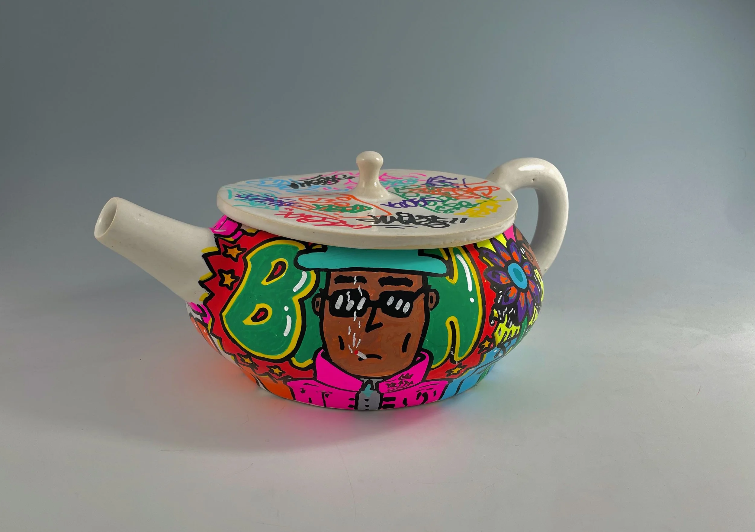 Moving beyond my production-perfect mugs and candles, I am now exploring a mixed-media, graffiti-inspired approach to pottery. Graffiti expresses thoughts and emotions through text, symbols, colors, and secret ciphers. It is the language of the street. I use it to intimately personalize my work. This style comes as a significant break from my previous work and the classical tradition of ceramics.