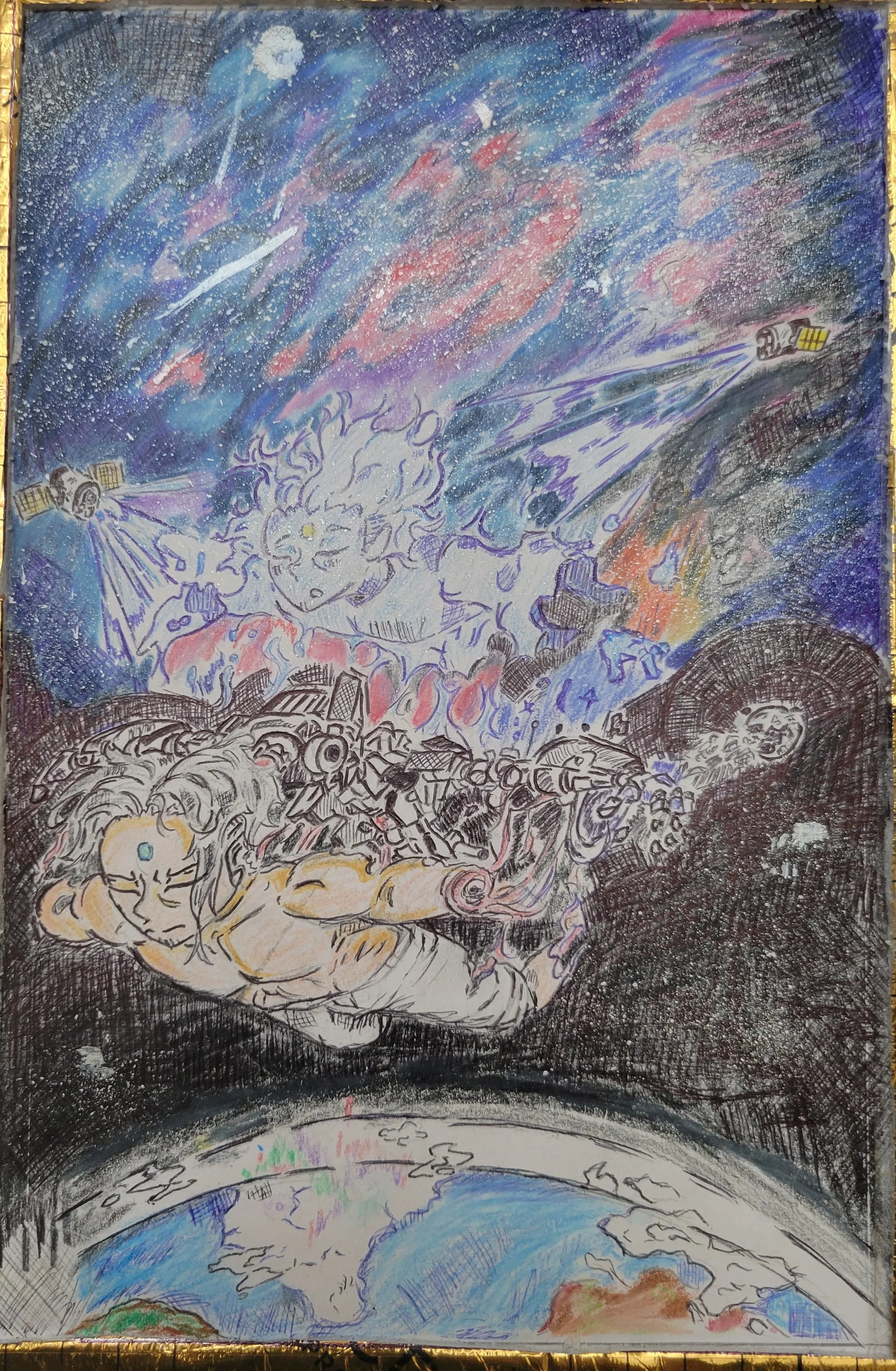 I started off creating the outlines of the main humanoid figures of the art piece, then the rest of the objects. Once that was done, I then started to blend and layer the ink pens and Prisma colors.