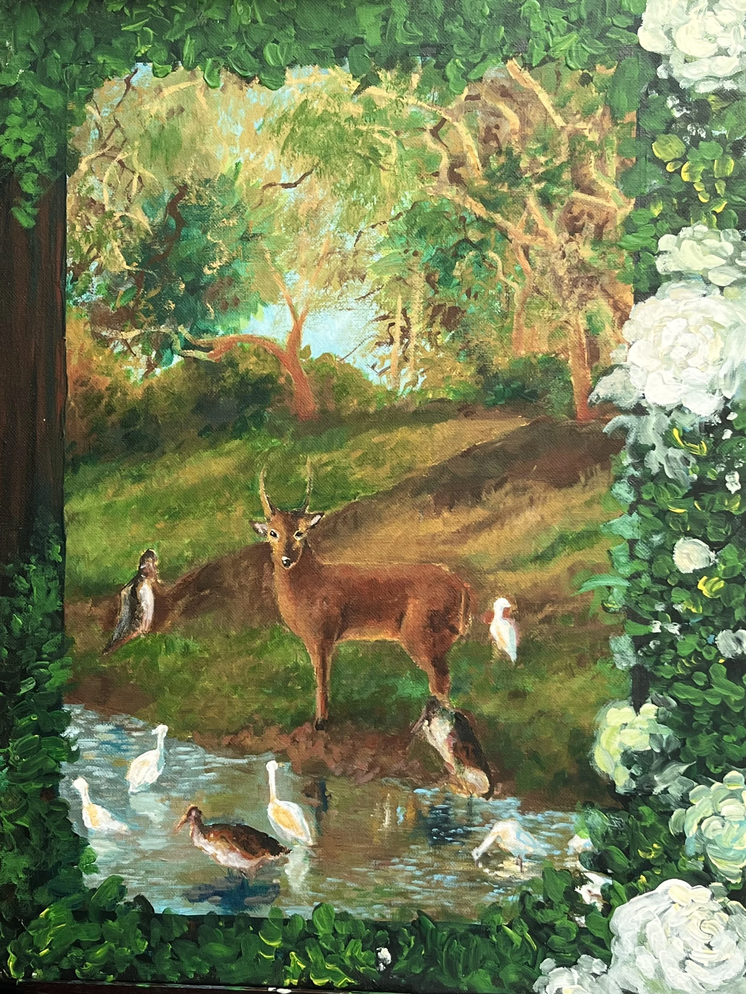 Often people see nature and animals through an unnatural filter. Documentaries, zoos, videos, these forms of media often turn animals and nature into entertainment for us. It prevents us from fully interacting with nature and understanding it. In this piece, the deer stares directly at the viewer, bypassing the frame that humans place on it. We can ignore it no longer, as it represents the desire to reconnect with nature again.