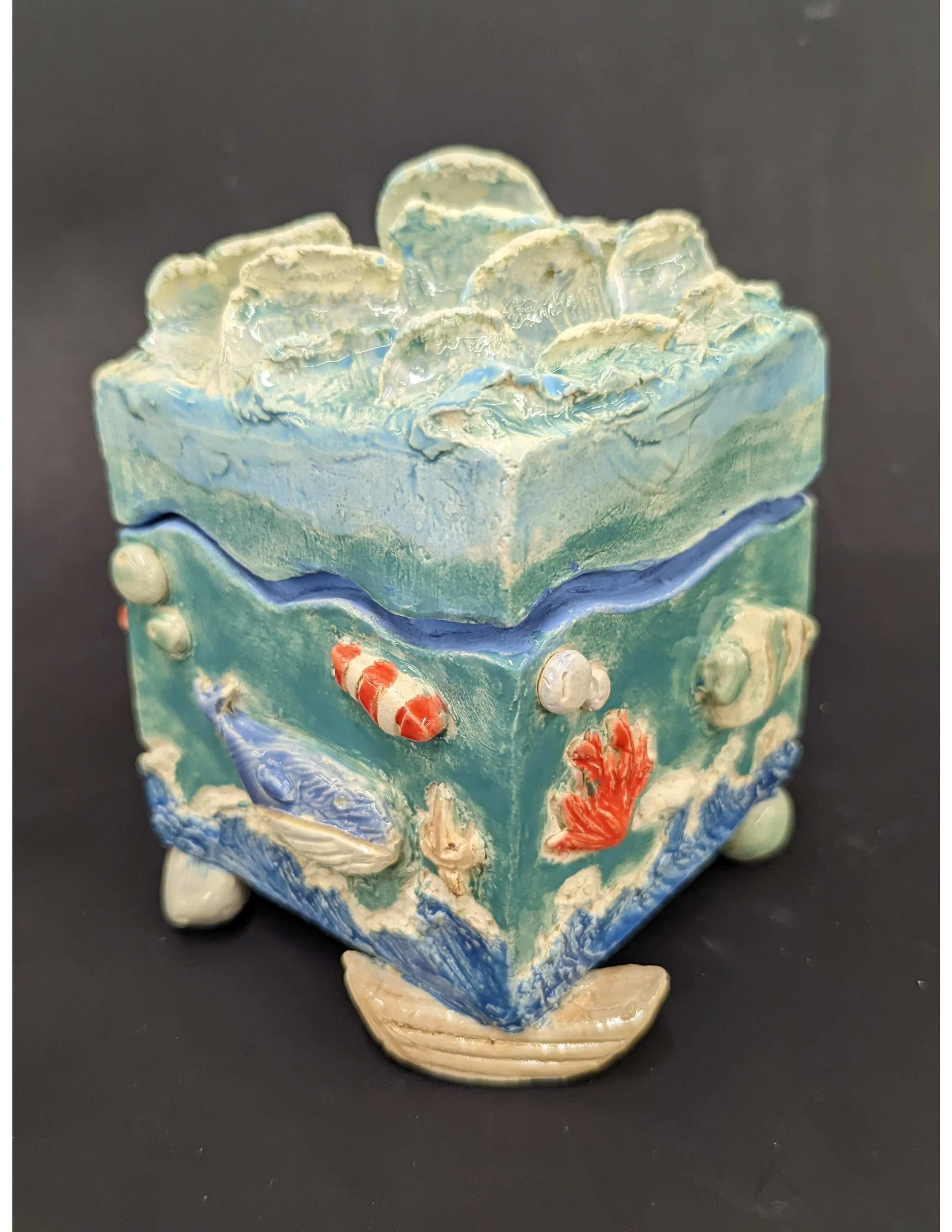 Throughout the box, my work has the dominant theme of aqua green, green, and blue. I have generated a multitude of textures to give the waves the most realistic look. Furthermore, overglazes have been applied to the body and the handle part of the project. I used underglaze inside of the box with clear glaze as the second layer, as well as on the edge and the bottom of the stand.