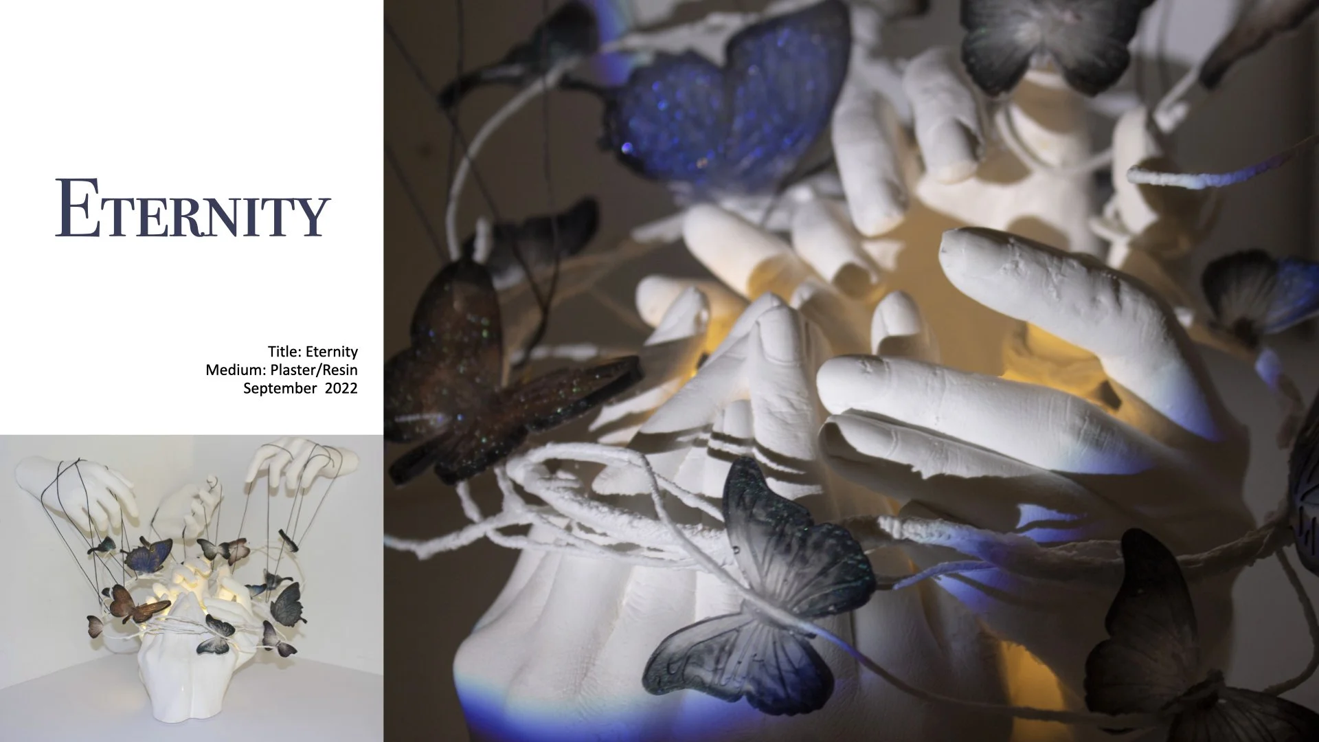 To articulate on such behalf, I have carefully chosen durable materials such as plaster mold as the foundation of my work, accompanied by resins, lights, and threads to convey a fragile and intangible undertone, as elicited by the melancholy for the deceased. I placed the installment piece in two diagonal cardboards, drawing all the light sources to the dim but warm-toned LED lights inside of the hands. The obscure lighting and enclosed setting underline the themes of life and death. By recreating the shapes of hands using mold powders, I tend to present the living ones, as they are grasping very hard at the drooping threads, something untouchable. I twirled plain white papers into a shapeable string around the hands to locate and stabilize the butterflies, positioning them into fluctuating places to mimic their beautifully unconstrained movements, a critical affection discussed in my proposal. The butterflies are made out of resins and color pigments of low saturation, displaying opacity and highlighting the intangible and ethereal occurrence of death. The drooping threads held by the hands extend vaguely to the butterflies, unchaining them in a loose grasp. The interaction between the hands and butterflies is somewhat indicated by the sagging threads and durable paper strings, where they are merely untouchable but profoundly connected, resembling love across life and death.