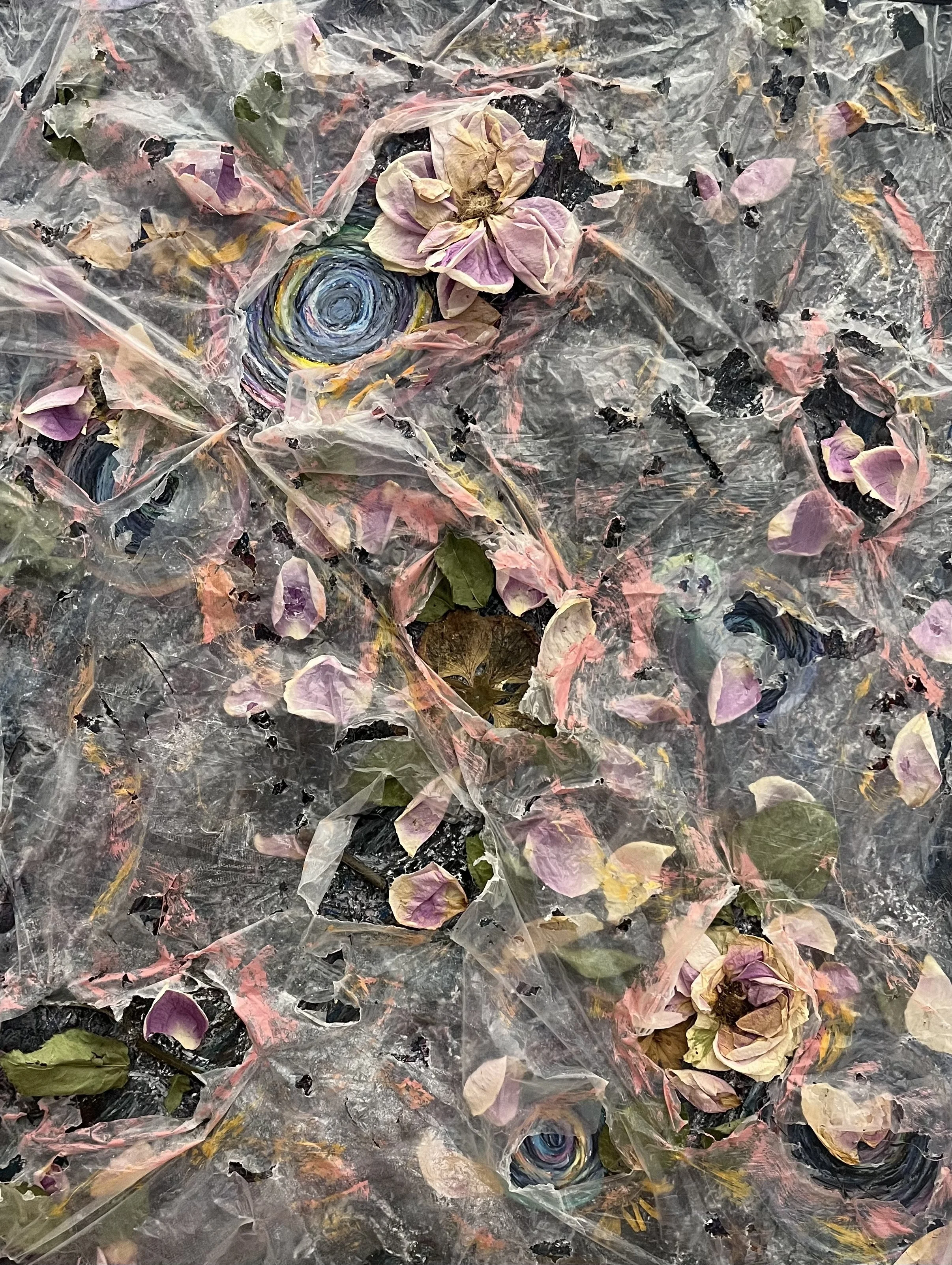 My muse was the Earth, ripples in puddles and rain soaked soil, all smothered by plastic. The darkness of acrylic, layered like grooves in terrain, spanned organically across my paper. With darkness came light, oil pastels over rugged texture, creating layers and dimension through diversity of hue and chroma. Ripples upon soil were depicted through oil pastels on pasted circular paper, emphasis upon the light of the water that nurtured life below. Before expressing the life blooming, I expressed the life lost, pressed flowers laid flat on the surface, representing all that’s been lost to the suffocation of plastic’s touch. With the death of a bouquet came new life to my piece, stems creating movement below the surface and rose heads becoming the birth of life. Between life and death lies an in between: falling petals and dried leaves, losing their color slowly but surely. A sheet of plastic, already torn from the ceramics class, became the true symbol of the plastic that suffocates. Holes and rips represented gasps of breath from the Earth, punctuated by the salmon pink of raw skin around the edges of the holes. Gaia’s Suffocation speaks of suffering untold.