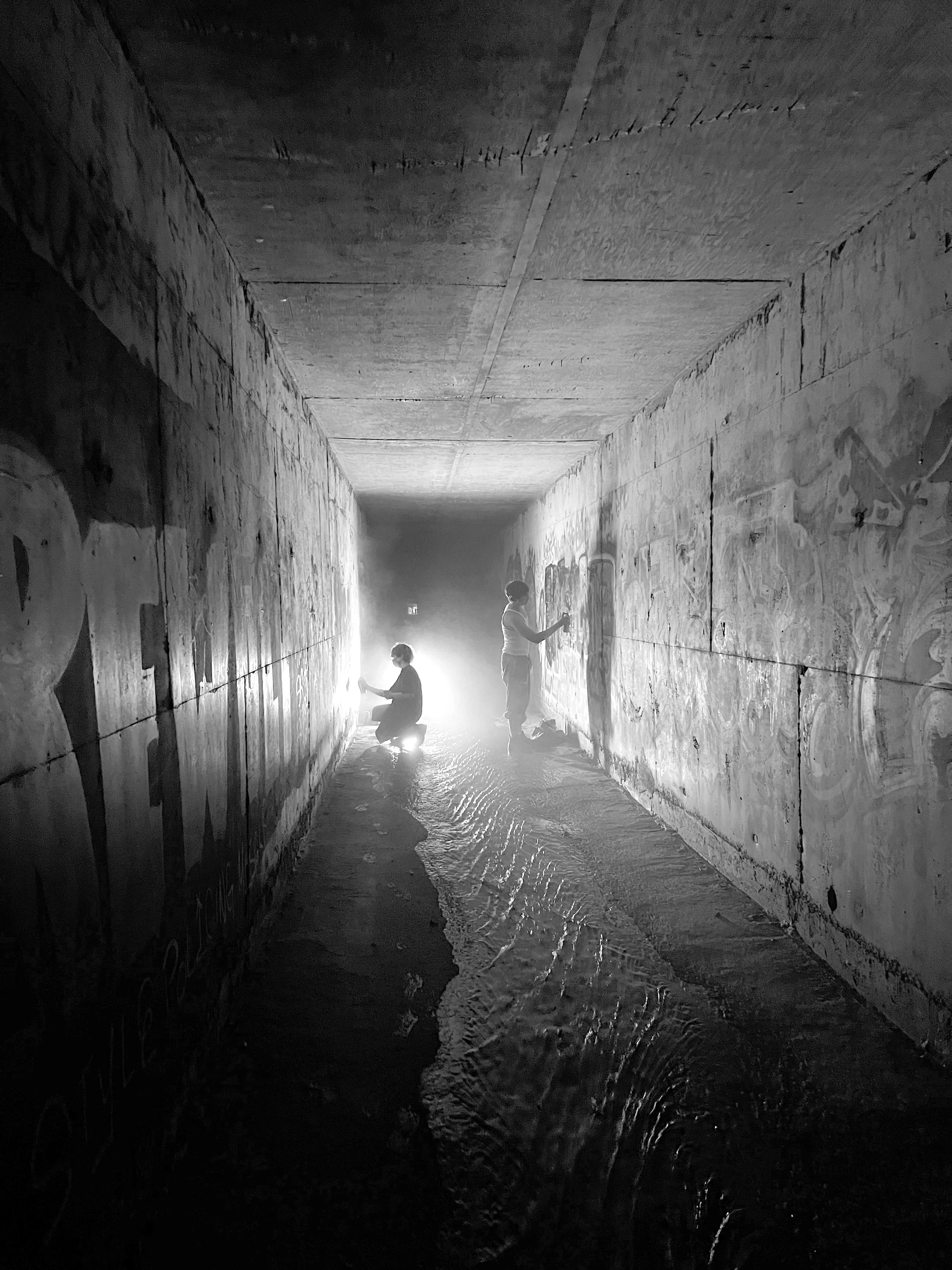 This photo was taken in a underground tunnel in Oakland, California and depicts to friends of mine spray painting.