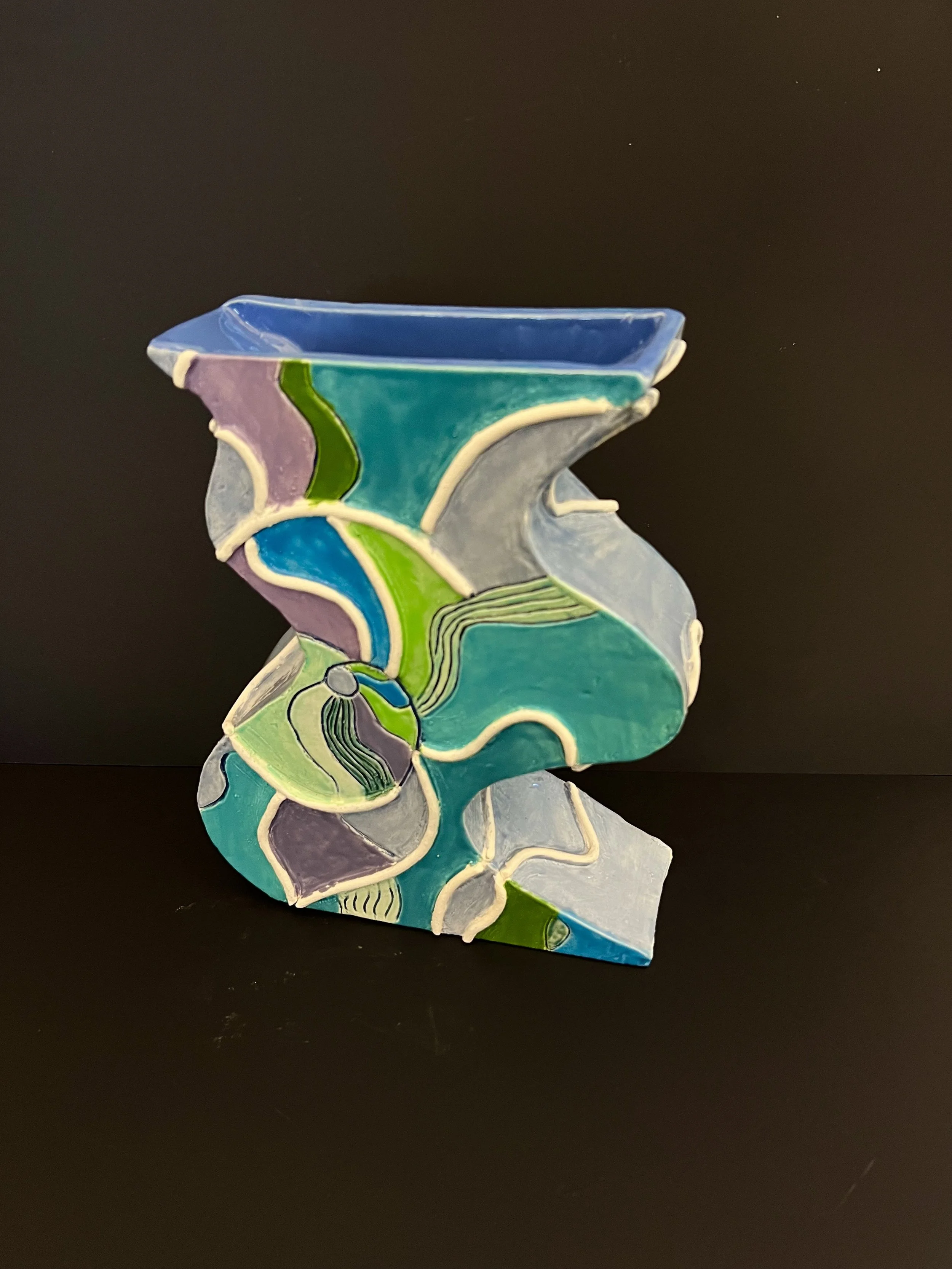 In creating my “Kaleidoscope” vase, I tried to show the complexity of the mind and how it is constantly moving around with different bright ideas. I was inspired by my surroundings, and my own struggle with dyslexia as my head is constantly filled with different thoughts that aren’t always in straight black and white lines but rather spirals and colors. I love the color palette of blues, greens, and purples and thought it worked well with my piece. While constructing my vase, I wanted to challenge myself with a piece that was made with waves and wasn’t a straight slab or coil construction but rather a slab construction with designs carved and glazed on top.