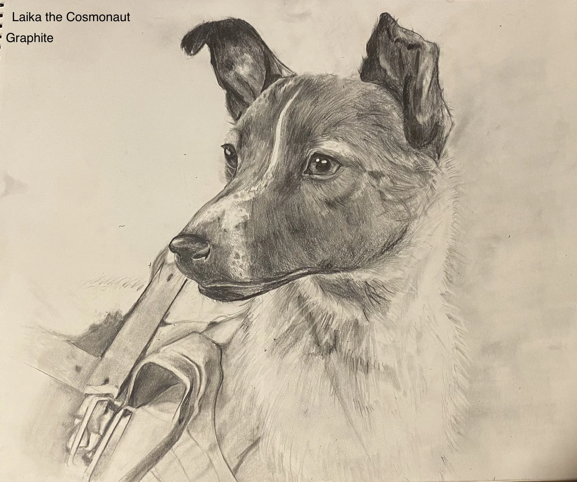 My artwork depicts the first dog in space, Laika, who tragically passed away in space. My artistic process was used with a mix of charcoal pencils, graphite, and an eraser. I used blending stumps to try and create a smooth effect on the fabric and a dirty look.