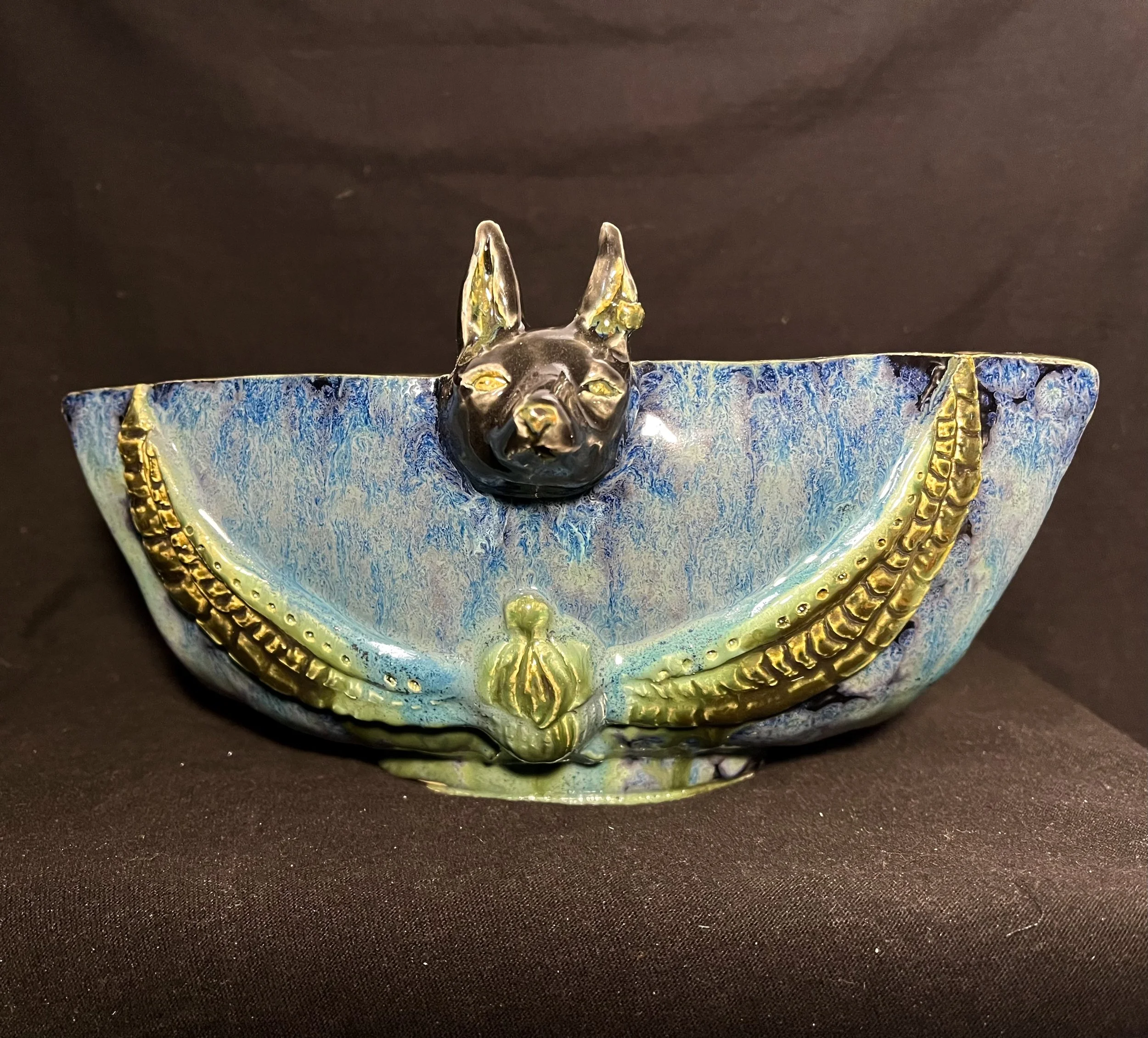 My artwork is a cultural bowl. Created with the inspiration and appreciation for the beautiful Egyptian culture. Going into this project I want to capture the beautiful artwork/representation of old Hieroglyphic writing but being mostly focused on their eye catching Scarabs and there God “Anubis”. I did extensive research before creating my peace with the goal of not presenting anything disrespect or offensive. I wanted to show my love for Egypt’s most beautiful artwork and my appreciation to the artist of the past for their time consuming work. when making my piece, I started hour will slabs of clay over a hump mold I has created with tape and paper. Once my clay was dry I removed it from the mild and reshaped some area and the proceeded to and details and so on. Once my project was fire I proceeded to glaze it with a specialty glaze then sending it back for another firing.