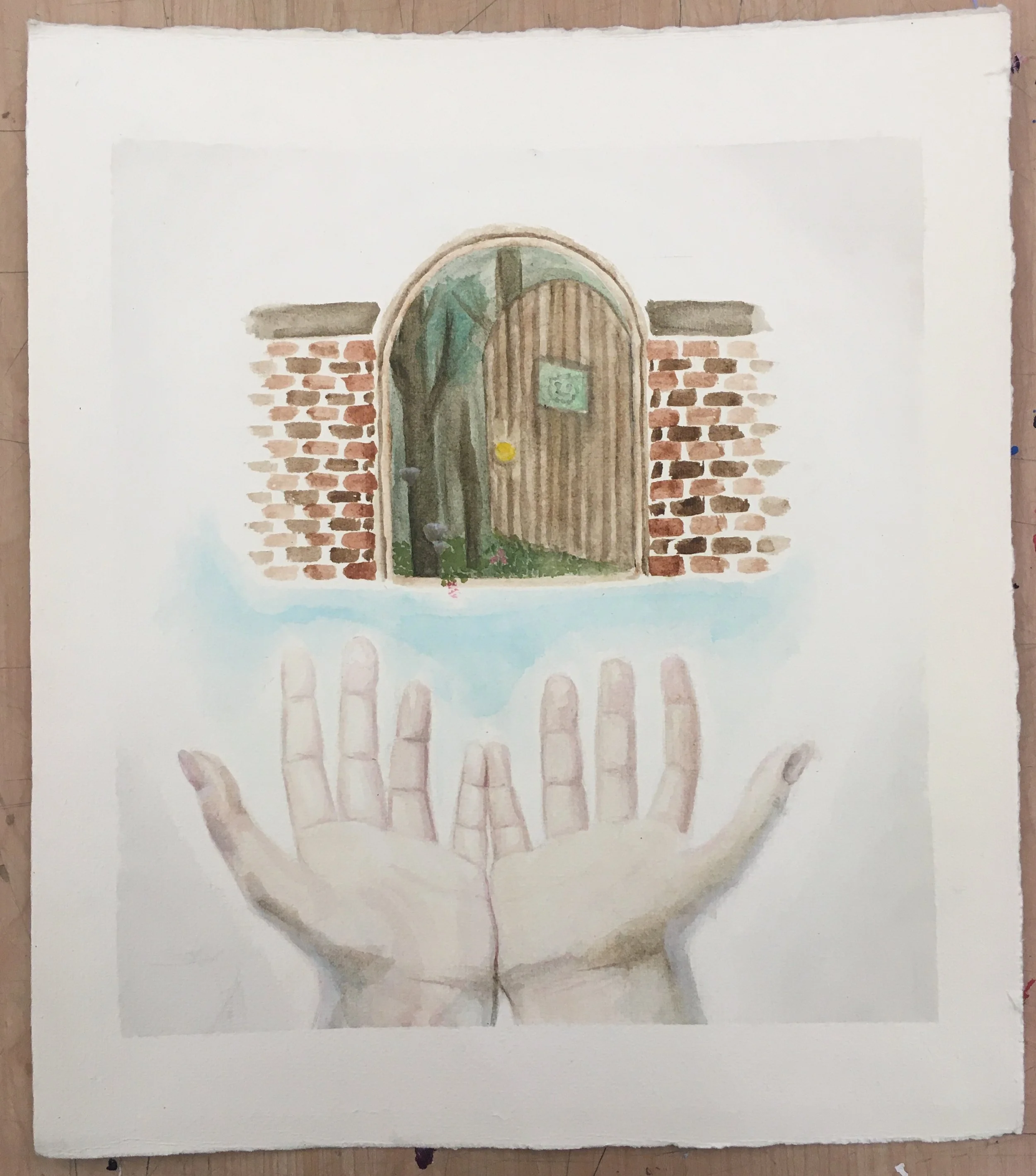 This piece was my sixth piece for my AP Drawing Portfolio. My theme is about my relationship with my older sister, and this piece represents the imaginary worlds we create. This piece is watercolor on white watercolor paper. I began with the hands, adding the door and details after. I ended by adding a hidden "easter egg": the little green flag on the door is the flag of the country my sister and I created in our living room as children.