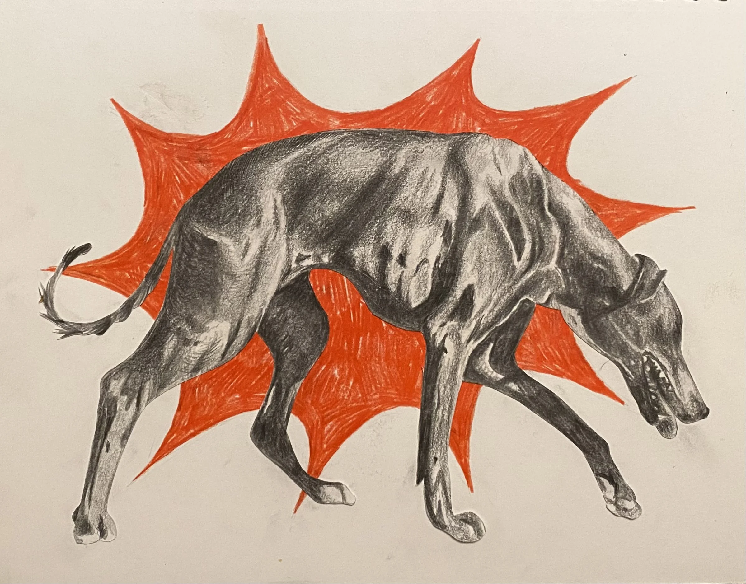 This piece was my depiction of an aura of strength and power. While making it, I chose to use contrasting colors along with sharp and smooth finishes to capture the opposing sides to strength, which are subjective to all individuals. In this piece, you can see that the dog has an elegant strength on the surface, with a muscular and controlled appearance. Surrounding the dog though is a representation of internal power- the mental strength behind the muscle and bone. This internal strength is jagged, unruly, and vibrant, coexisting with the still present elegance and control.