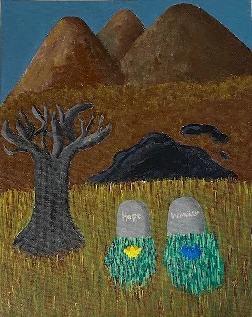 In this piece I want to convey how the world seems like it is dying (mostly because of climate change, but for other reasons too), how we have buried the "Hope" and "Wonder" we should have for life, yet they have managed to come back and be "reborn". The meaning of these words may change slightly from person to person, but those to things will exists as long as one person believes in them. In the illustration I have shown a dying landscape, with two tombstones at the foreground one with 'Hope' engraved on it and the other with 'Wonder'. That is to represent their "death" but because someone somewhere still believes in them, they have come back. Their rebirth is shown by a small plot of green grass and flowers sprouting around the tombstones. The engraved words are also not visible from all angles, to represent how not every one will believe in these things, that you have to view thing in a certain way to believe.
