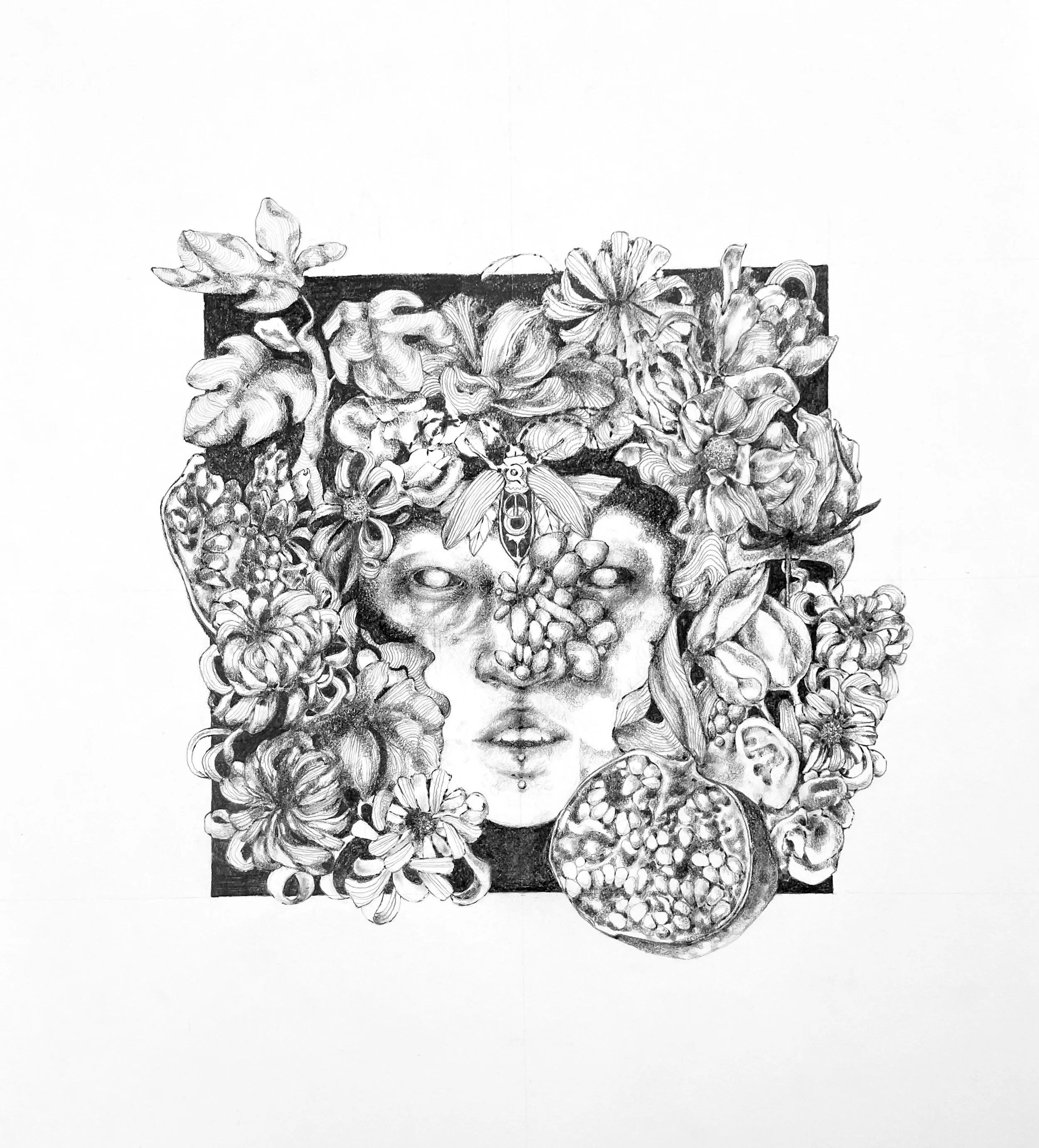 I worked on Salient for eight months before finishing. Rendering graphite is, at its core, a test of patience, and I often found creating this work forced me to slow down and trust a final result would emerge. I aimed to capture the decay of youthful innocence through a connection to nature: with shattered realities and dead old-selves comes growth and rebirth.