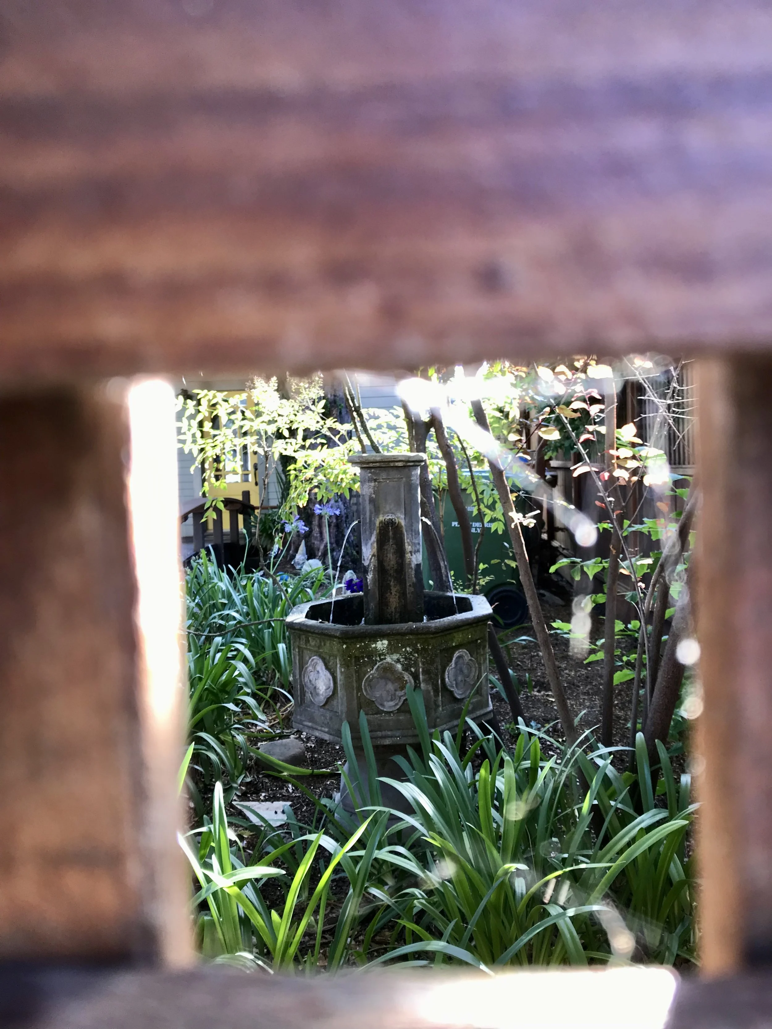 I found this fountain while on a walk in my neighborhood and took this photo through the gap of the fence. To me it captured the feeling of an outsiders perspective on this peaceful magical scene.