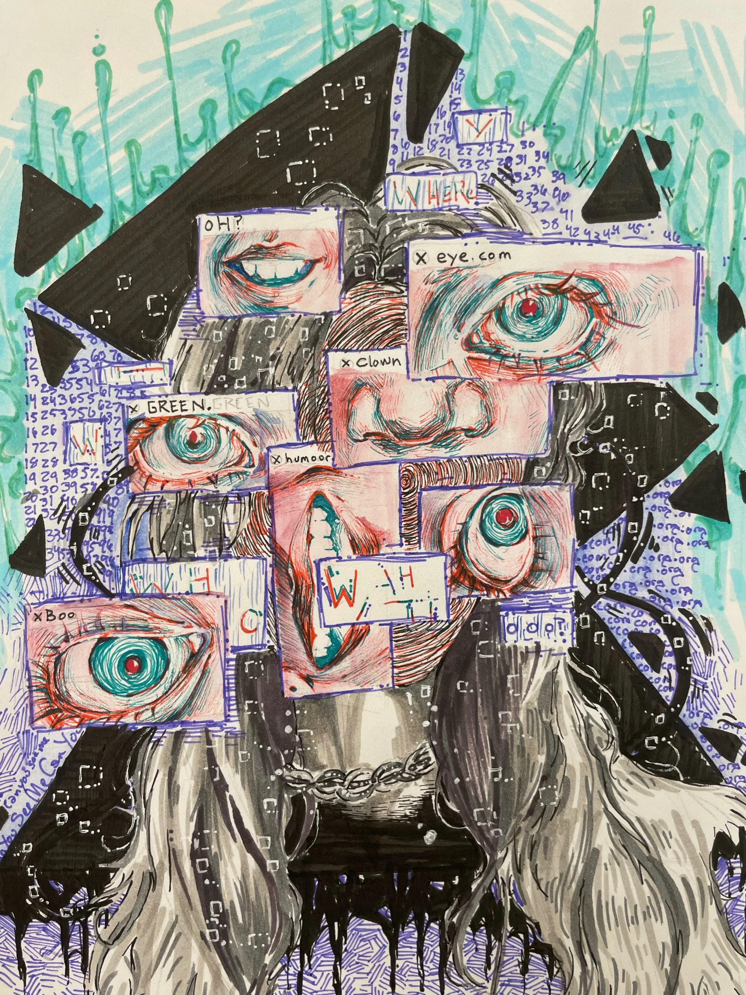 I hoped to capture a sense of chaos with this piece. A sense of confusion as to what the viewer was looking at. The feelings I put into this piece for others to think about are ones that I feel everyday even in the most mundane moments. Putting these experiences on paper in a way they are not seen in real life is what I tried creating.