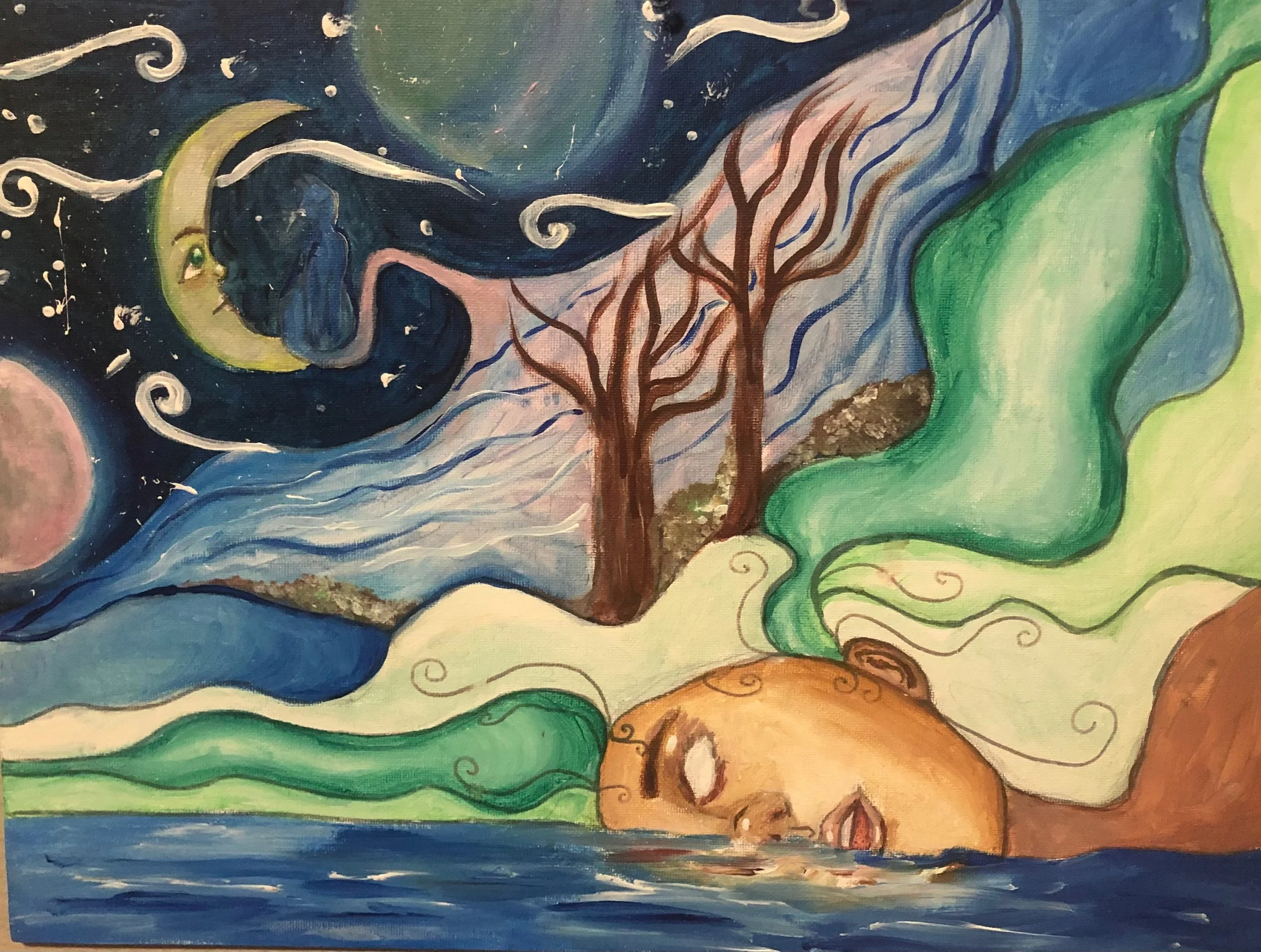 The painting depicts a siren bathing in the moonlight, with a melancholy vibe and a use of different hues of blue. It portrays a sense of surrealism. I was inspired by the enchantment of siren mythology.
