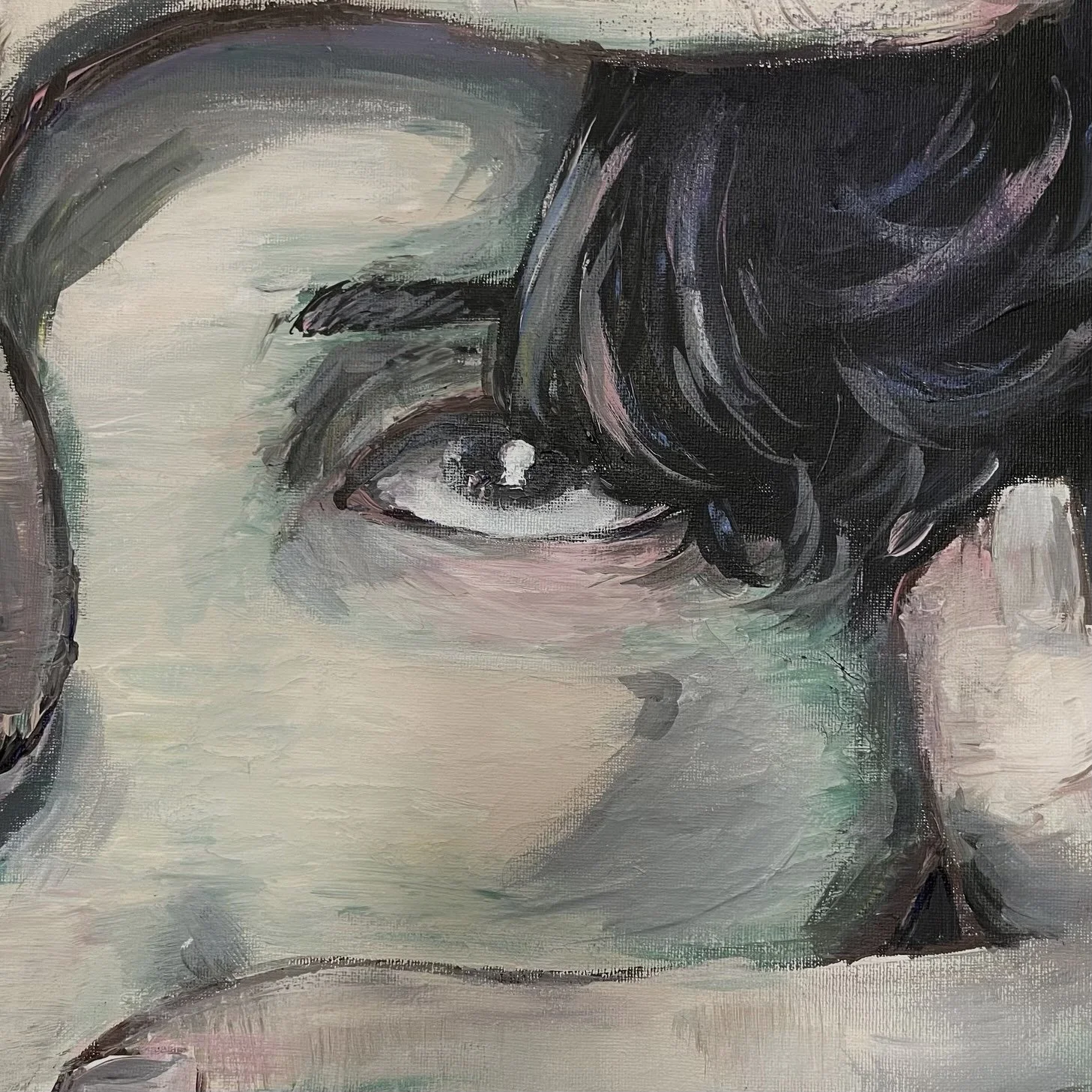 I decided to use acrylics for the majority of the painting. Once I had thought up an idea and taken a reference photo, I would paint, not caring whether it was a replica of my reference but a vague visualization of myself as an artist. While painting, I minimized my color palette to pink, teal, white, and black. I'm using unblended, patchy shading to show the early stage of life I'm in. The hints of soft pink underneath the eyes and the tips of the fingers draw focus to what an artist's most important senses are: touch and hold. Hands to hold my tools and eyes to see, adapt, and overcome. I use a dry brush to add texture to my hands, which frame the image and center the eyes. Adding dulled periwinkle to the areas with hard shadows encroaching on hues of teal will show the intermixing of normalcy and drive.