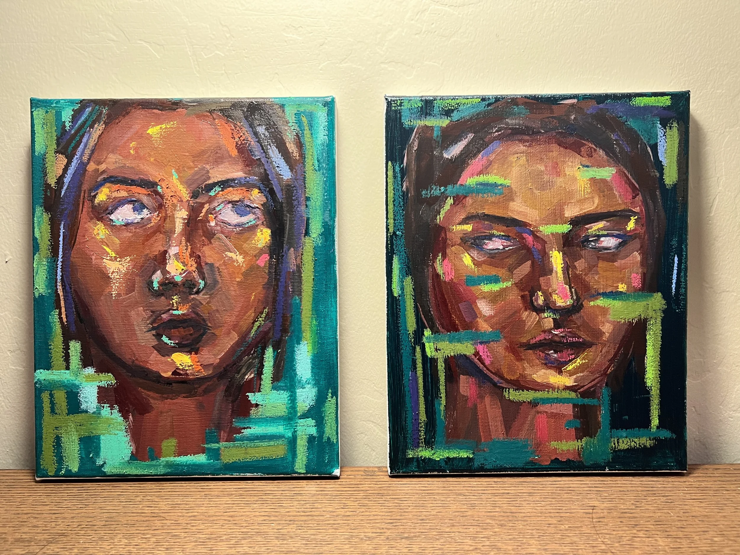 This happens to be the first time I’ve used oil paint, so learning how the opacity and translucence can affect the dimensions of a subject was especially difficult. I feel that may be another reason I chose to use faces, because a face is something I am extremely familiar with creating. I watched countless tutorials on YouTube and such, and decided this piece should use many contrasting colors to continue to convey that feeling of unknowing and uncertainty. I filled the left canvas with a lighter green tone and the right canvas with a darker green tone. I then sketched out both faces, the left one looking up with wide dreaming eyes filled with aspiration, and the other one sort of shying away giving the left one a judging side eye. I used a flat brush and avoided blending as much as I could to go for a textured and human feel. I filled in the darker tones for both paintings with a cool blue tone, and continued layering in warmer colors until they both looked like faces. I went back in with cool tones for the more deep parts of the face like the crevices of the nose, the jawline, and corners of the eyes. I used a light yellow to highlight the parts of the face that stick out like the tip of the lips, nose, forehead, and browbone. After the oil paint dried for about a day, I used oil pastels to create more texture around the eyes, highlights of the face, and hair. I also used pastels to add texture and feeling into the background, which were straight strokes of different shades of green. For the right piece, I put strokes of green through the face because I wanted it to portray a subconscious aura, something that is stuck in a way in someone’s thoughts. Throughout painting this piece, I painted both canvases at the same time because I know as I learn, my style and technique change throughout the piece. I wanted the two canvases to share as much of the same style as possible Since they are both the same work of art.