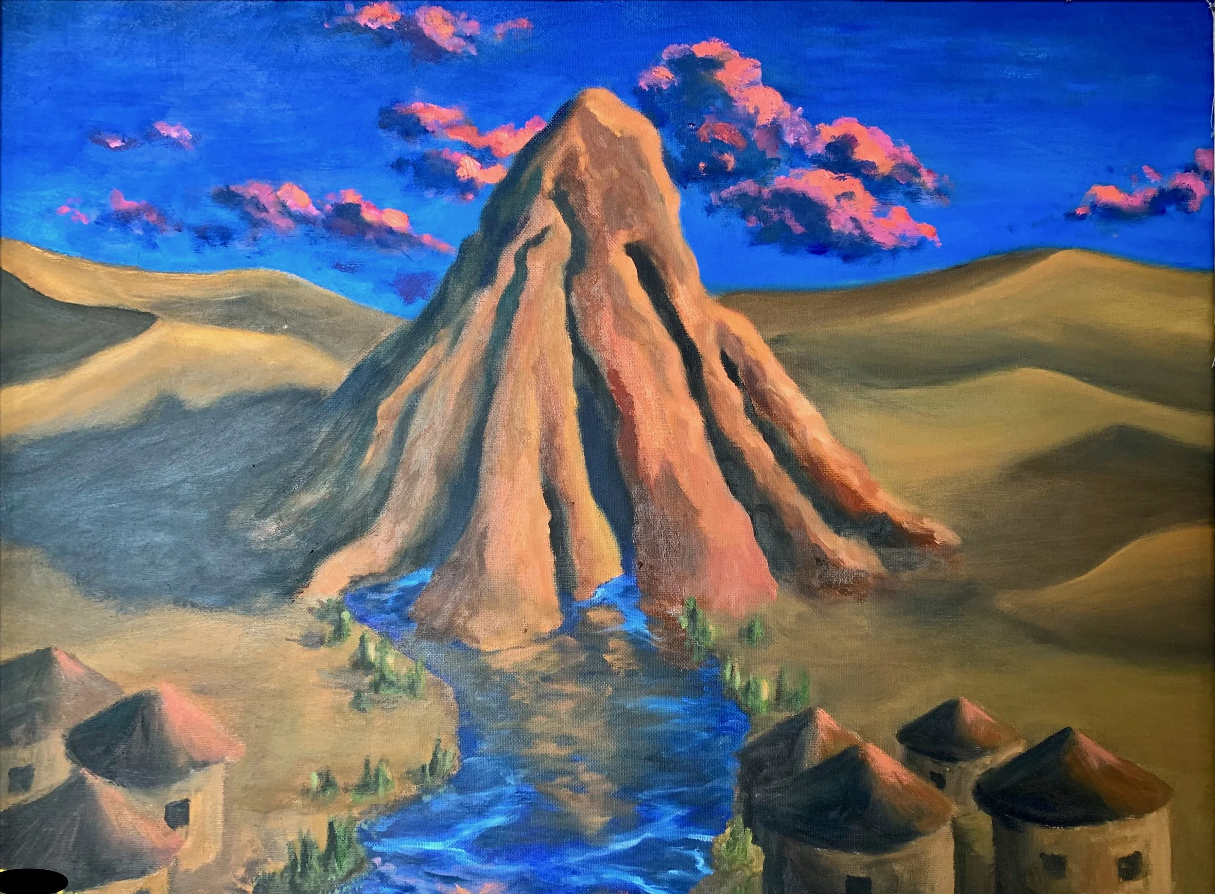 In my artwork, I represented this through the geographical anomaly of the mountain, which appears almost out of nowhere in the desert. The river that leads from the mountain is also unnatural, displaying its supernatural properties, and in the river is a light that represents the god's energy passing from the mountain to the people, who are in the village in the foreground.