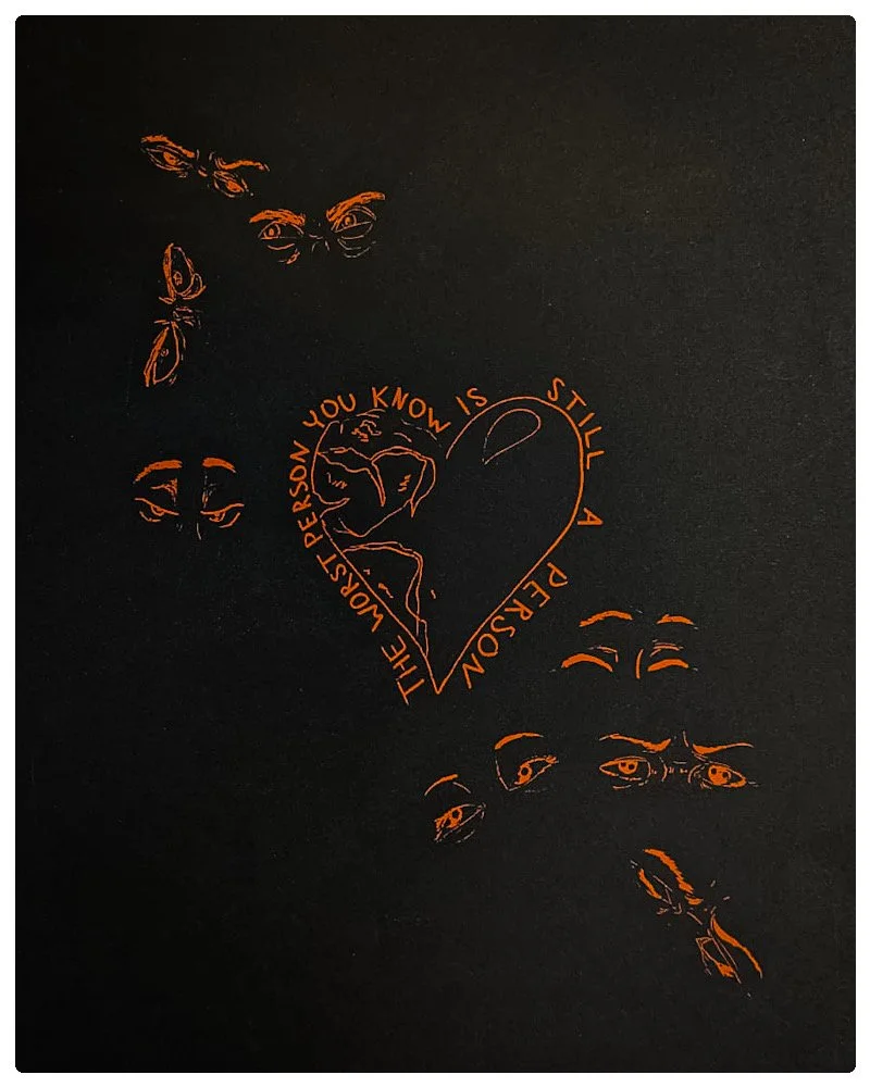 I created this design (digital, Procreate) for it to be converted to a silkscreen print on paper, with a program called Artivate. It was based on an interview we had with a resident of the local Harrison Hotel, who’s led a tough, yet very interesting life. The way he spoke on it was incredibly impactful overall, but the text featured in the image is one that highly stood out to me. I've always struggled with understanding why bad people do the things they do. Of course, logical explanations like desperation or greed occur to me, but the thought “are they even human?” has crossed my mind more than once. So, hearing him tell us with such confidence, ""Think of the worst person you know... they're still a person,"" made me say to myself, ""Wow. Of course. I, who puts so much importance on my empathy for others, sees people who hurt others as a different species? That's absurd; it just doesn't work like that.""