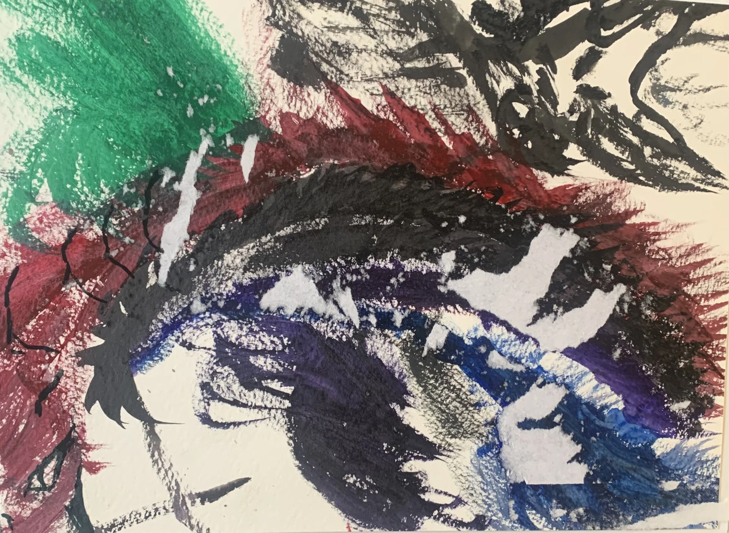 My artwork is a mix of my different emotions while I was making it in the garden, different textures and colors, I tried making it to be an abstract snake or dragon type thing, my head was all over the place during this project so I just started painting how I felt.