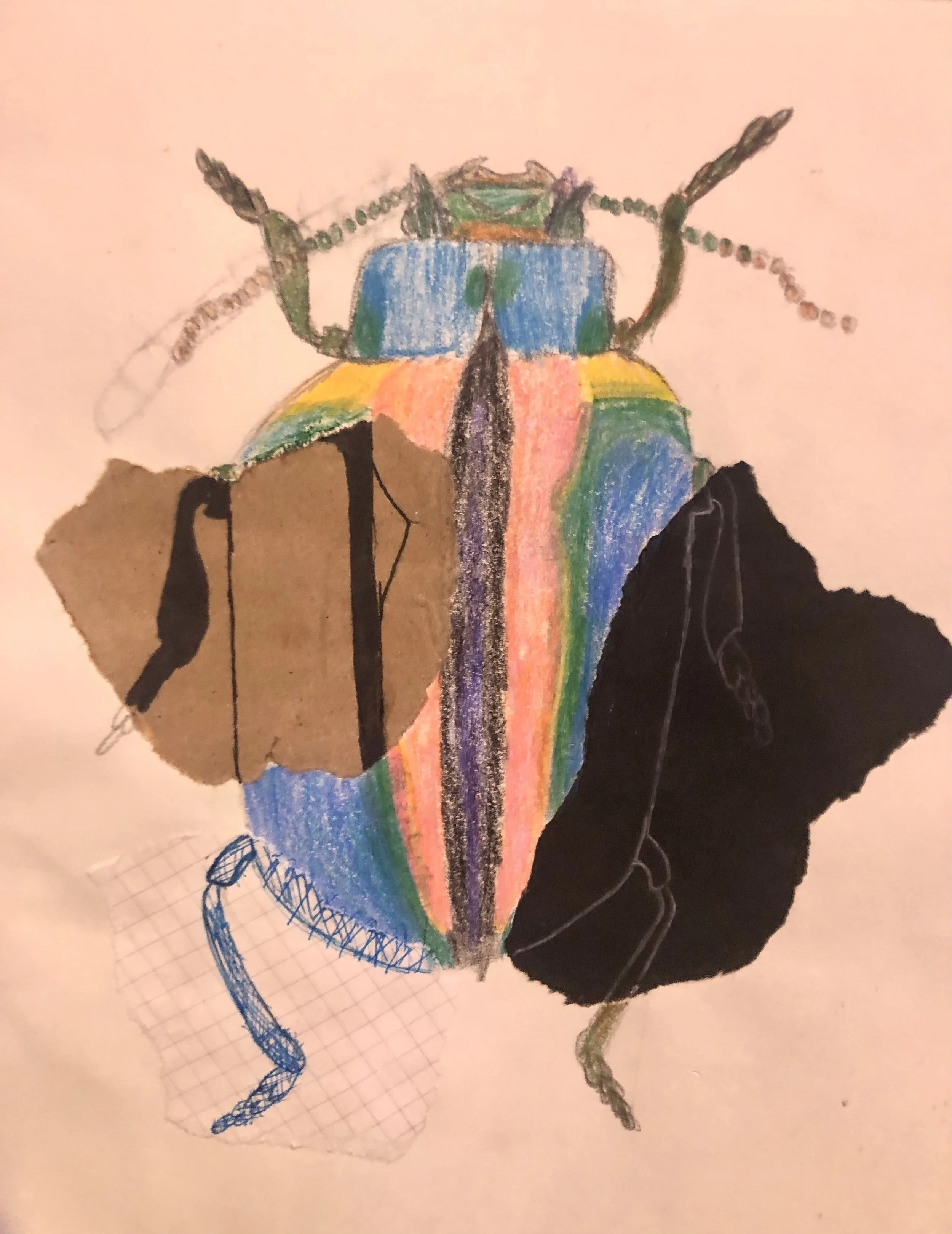 My piece is a combination of different papers, mediums, and art styles. I first drew the beetle, making sure to get all the fine details. Next, I went through with color and pen. Finally, I went through with a second round of pencils and pens to make sure I got everything.