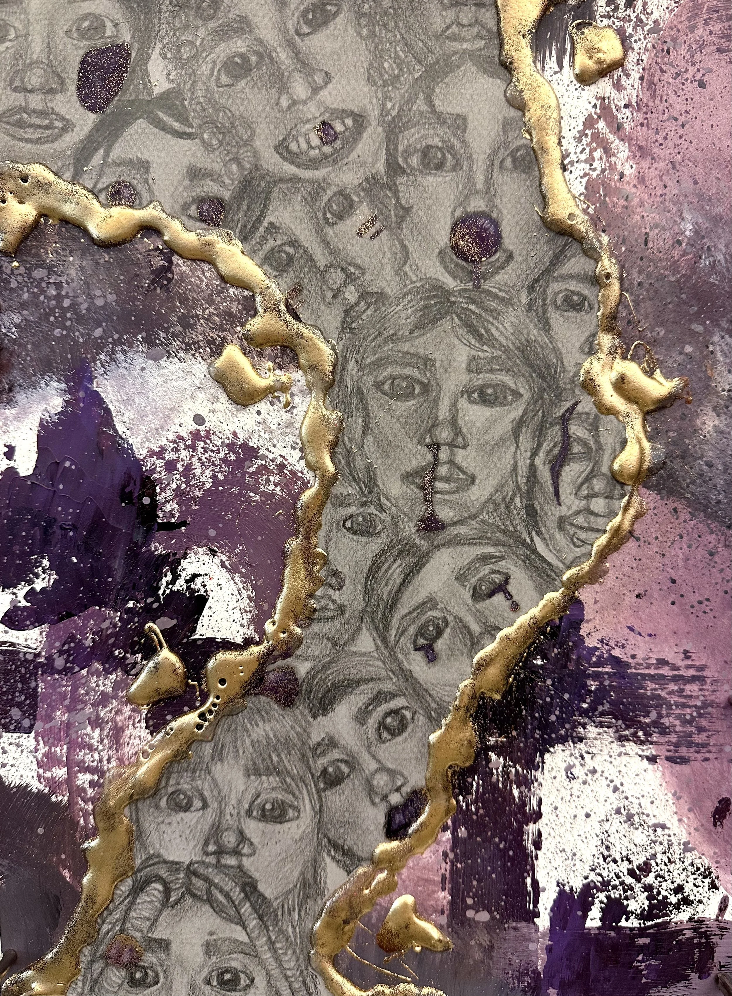 This piece was an exploration of processing different emotions that come with anxiety, body dysmorphia, depression, and other struggles my friends and myself grapple with. "Who Do You See When You Look in the Mirror" shows the faces of young women struggling to be themselves while battling these challenges: showing who they really are when they remove the "mask" that they show to the world. I decided to take on this challenging message to show others that they are not alone, no matter how they feel. The different emotions, shown by tears, blood, scars, and more, are painted in glitter to signify that our imperfections are beautiful, no matter the struggles that lead to them. Overall, this message of community and camaraderie across lines of difference is reflected in a thought-provoking way, as I use mixed media to elicit reactions and cultivate connections.