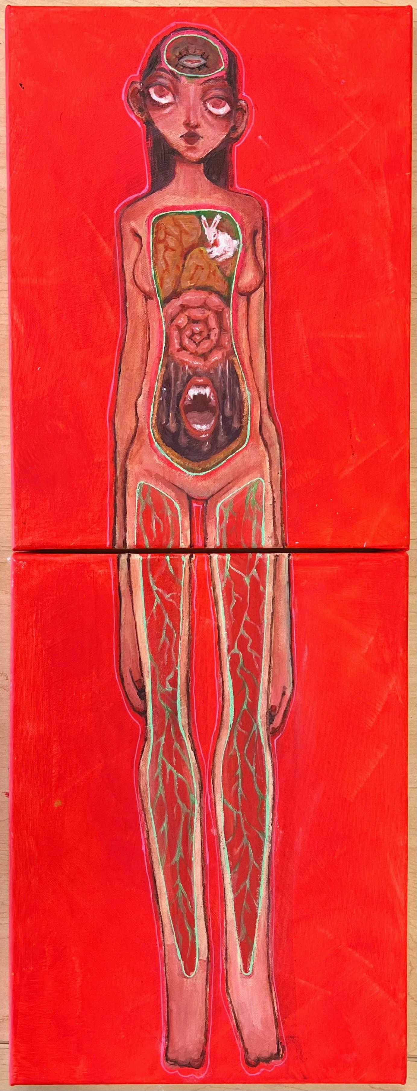 I wanted to play around with the idea that we really don’t know what’s inside of our own bodies. I used a mostly bright red and pink color palette to show fleshy vulnerability and slightly distorted proportions for a dysmorphic effect. This piece shows a kind of feminine rebellion against accepted truths of physiology.