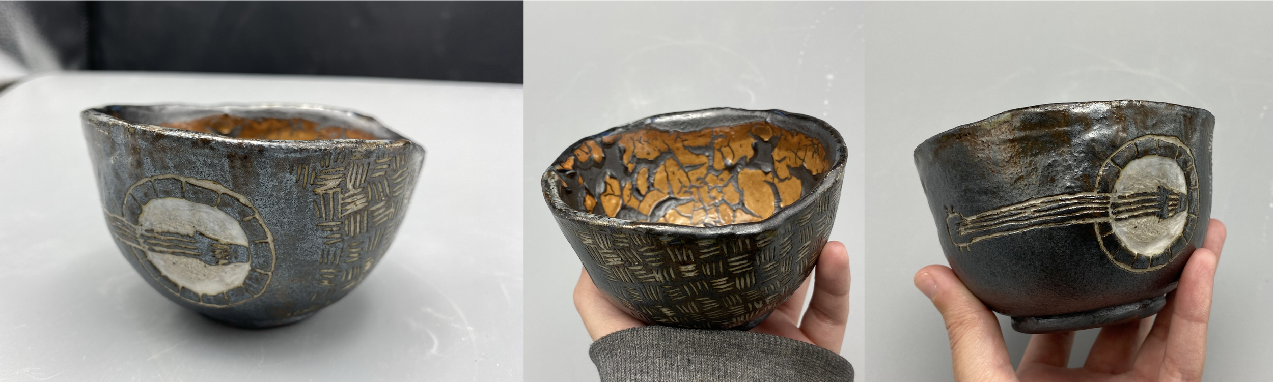 This bowl was made by draping a wet slab over a plaster bowl mold. After removing it from the mold and adding a foot, I painted the outside with barnyard slip. I used the sgraffito technique to carve out the shape of a bluegrass banjo and did cross-hatching everywhere else. I used two cone 10 glazes for the inside and sprayed the outside with a light layer of clear. The textured effect on the inside was not entirely intentional, but I like it! I think it adds contrast to the piece; the roughness of the inside versus the delicate work of the shell. Banjos are pretty cool and awesome in my opinion! my sibling plays bluegrass banjo and I play fiddle :]. we’re a regular bluegrass family.