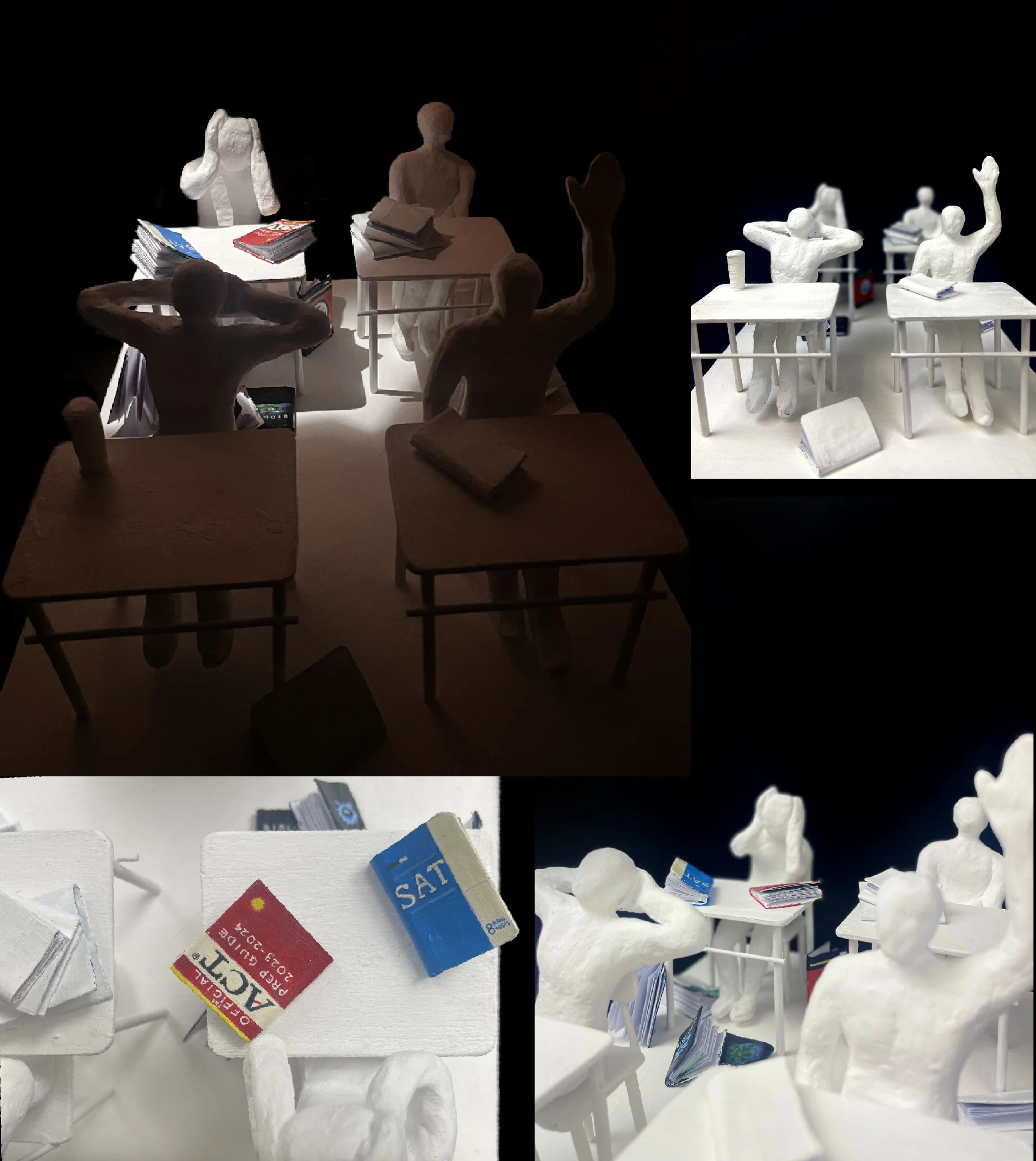 “Inconspicuous Amidst Brilliance" is an art piece that depicts three students flourishing effortlessly while one grapples with the challenges of simply keeping pace. While making this piece, our goal was not to depict three excellent students and one failing to excel with them, but to illustrate how difficult it seems to the struggling student. When considering our initial concept, we wanted to express each student’s individualistic and separate “color”. Upon further consideration however, we came to the understanding that most, if not all students struggle, facing high hurdles when achieving academic excellence, but to many, it doesn’t seem that way. The choice to paint the figures “blank” emphasizes the universality of the struggle: trying to stand out when everyone around them seems to be achieving great things in a competitive environment. Furthermore, when many do so while still presenting the appearance of a relaxed student, it becomes difficult for an individual when everyone around them is accomplishing more with less effort. We wanted to depict that the struggling student is keenly aware of his own shortcomings through the detail and color that is present on the books he uses to study, unable to realize that everyone else has textbooks that are not colored for him to see. Our goal was to prompt viewers to empathize with, and better yet, understand the challenges faced by individuals who strive earnestly, especially when they feel that they are unable to “stand out” when they encounter hurdles on their journey.