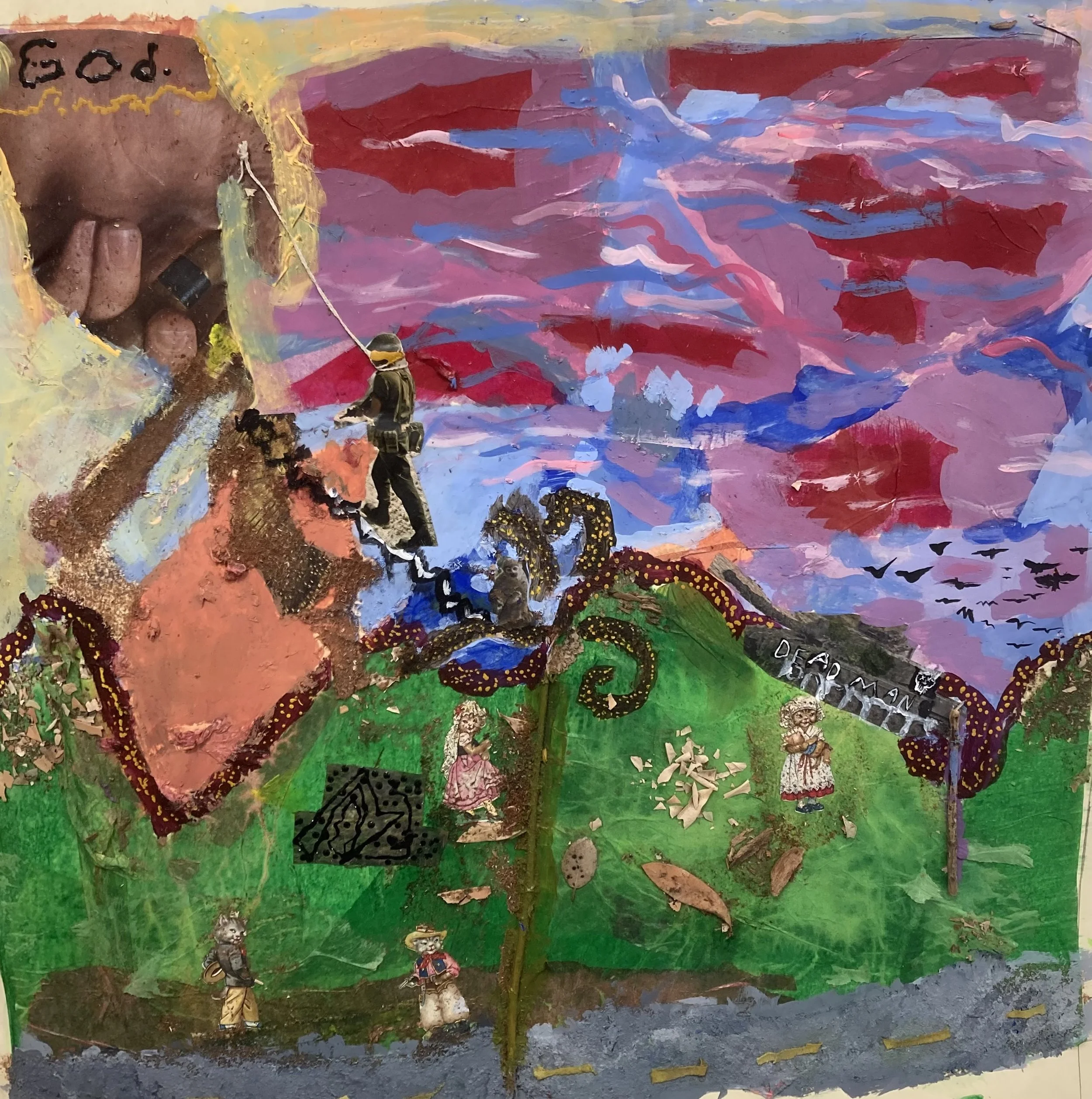 My art was an evolving piece where I just got ideas along the way as I did it, like the soldier with a rope around his neck was inspired by the old tank that had a dead man on it, and the background inspired the rest of the piece to be taking place in the mountains with population. What also inspired my artwork was that I did an art piece at the start of the school year. My other artwork had a railway, road, and a river. This artwork was inspired by the roadway. I also tried to replicate the sky when the sun was going down but that didn't go so well so I made it magical. The leafs and twigs were meant to be like a street light to but i didn't know how to paint a ray of light coming down so i turned it into just a dead twig in the middle of the canvas, also the dead leaves were meant to get crushed up and turned into powder but that didn't go so well either so i just glued the leaves on how they were. I would've liked to do better on the leafs part because that's the least favorite part of my art.